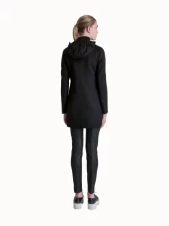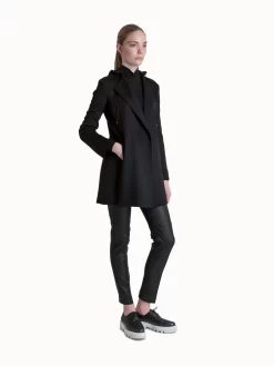 This long coat effortlessly fuses together function and style, the epitome of what makes Akris designs so unique and sought after. The elongated lapel collar is fastened in the middle by a snap closure. Features side pockets and a detachable drawstring hood.