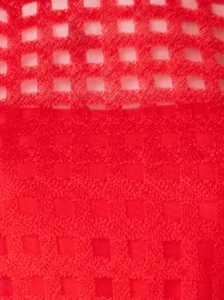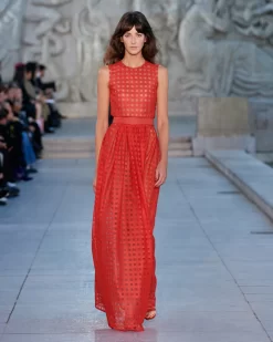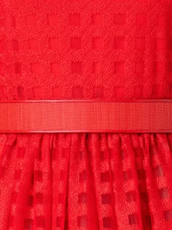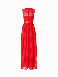 This gown is crafted in square embroidery on tulle, creating an airy look with architectural appeal. The fitted top, in combination with the flared skirt, creates a flattering silhouette. The included horsehair belt adds structure with the signature Akris touch.