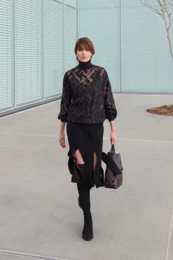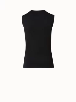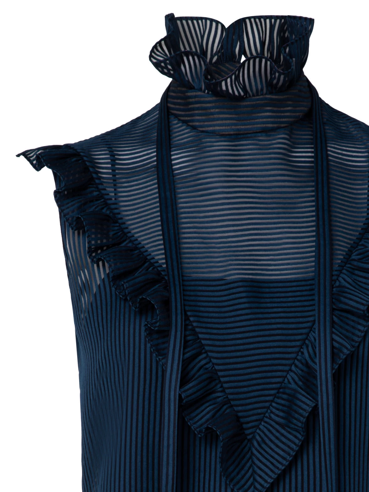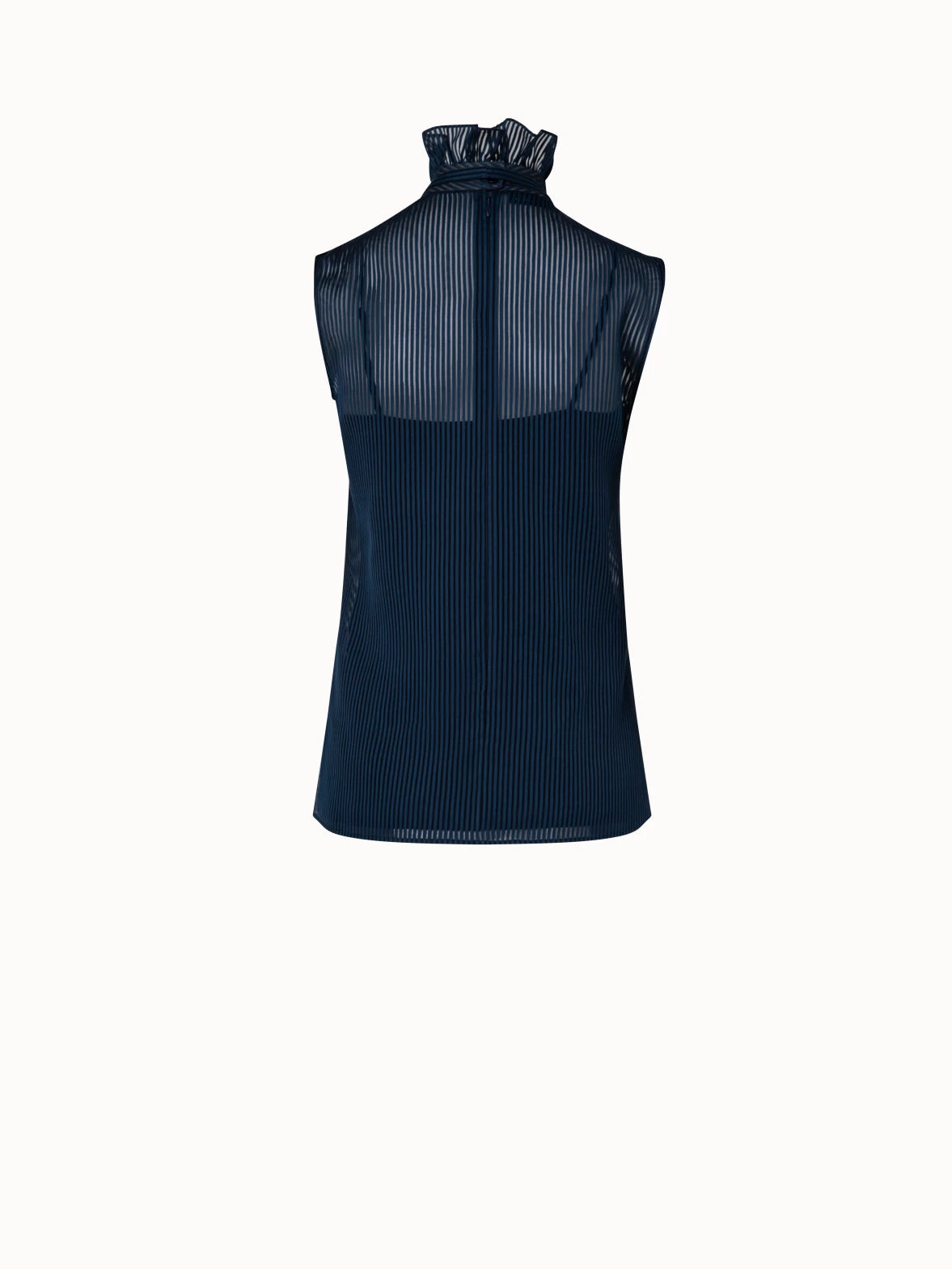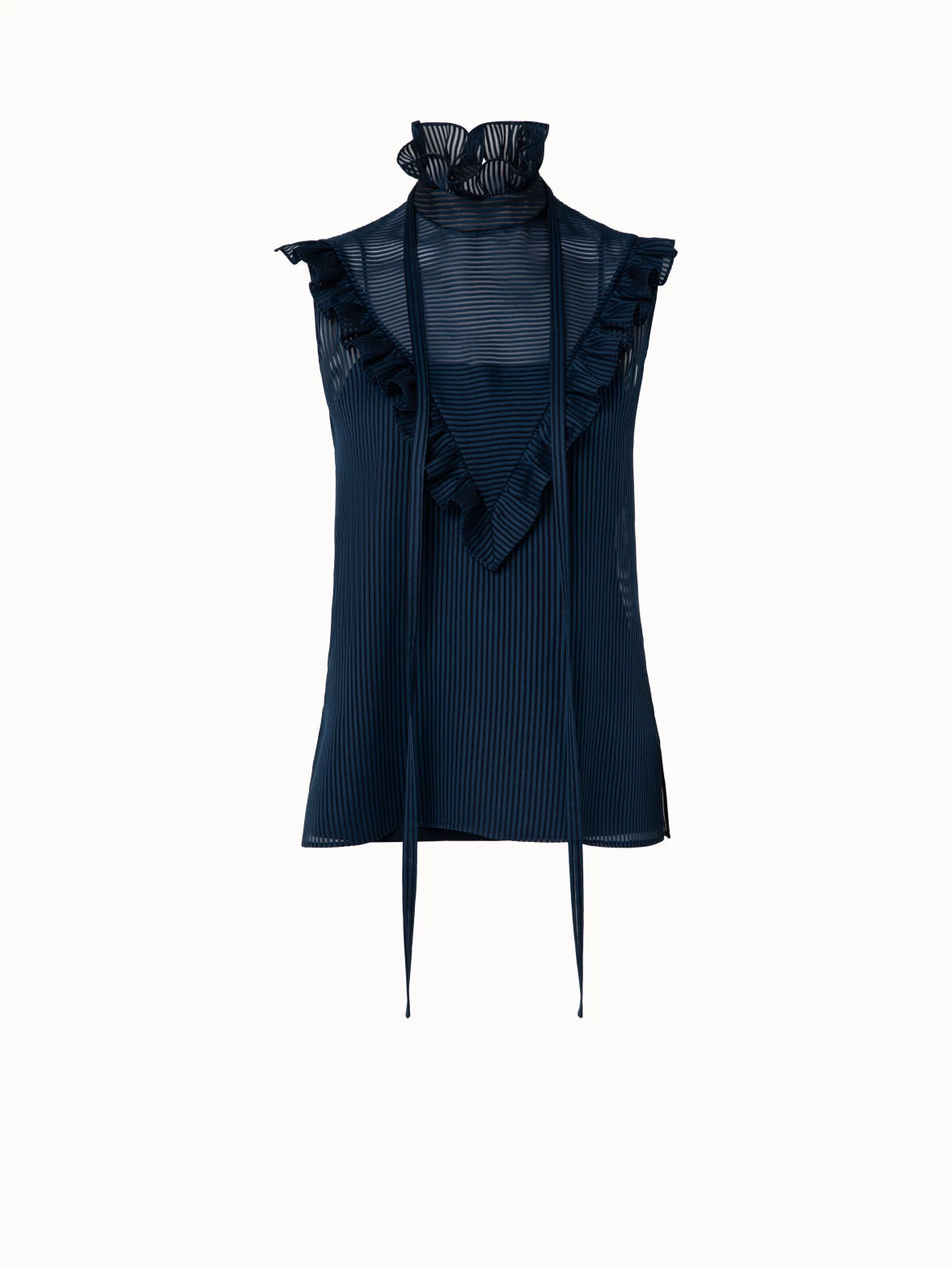 This sleeveless Akris blouse is crafted in a striped cotton silk organza fabric. As part of the Spring 2023 collection, celebrating 100 years of Akris, it features a ruffled mock neck and ruffles around the décolleté inspired by vintage Akris looks from the 1980s. Includes a slip top.