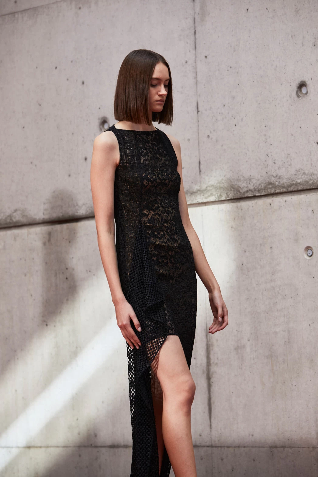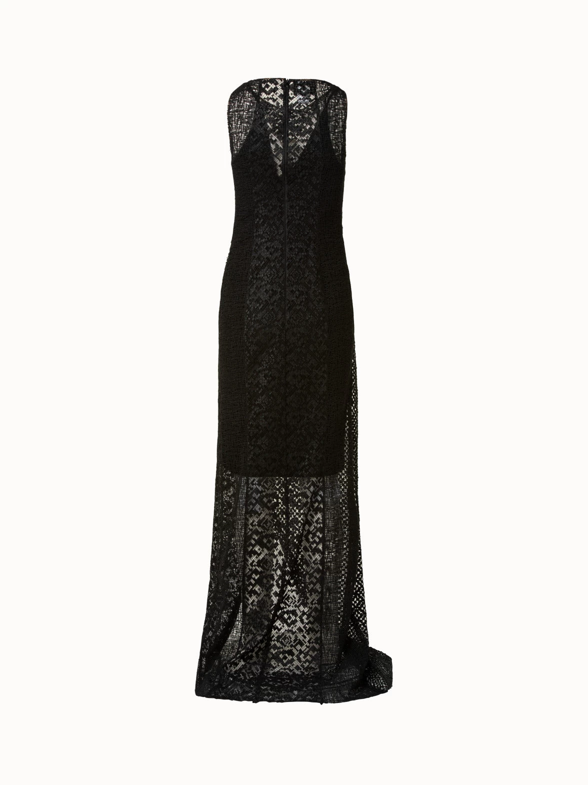 Akris’ expertise in craftsmanship shapes this gown from lightweight techno embroidery patchwork and molds it to the body with an elegant boat neck and a front apron panel ending in a train that moves beautifully as you walk. The nude lining provides coverage and peeks out delicately from under the sheer fabric.