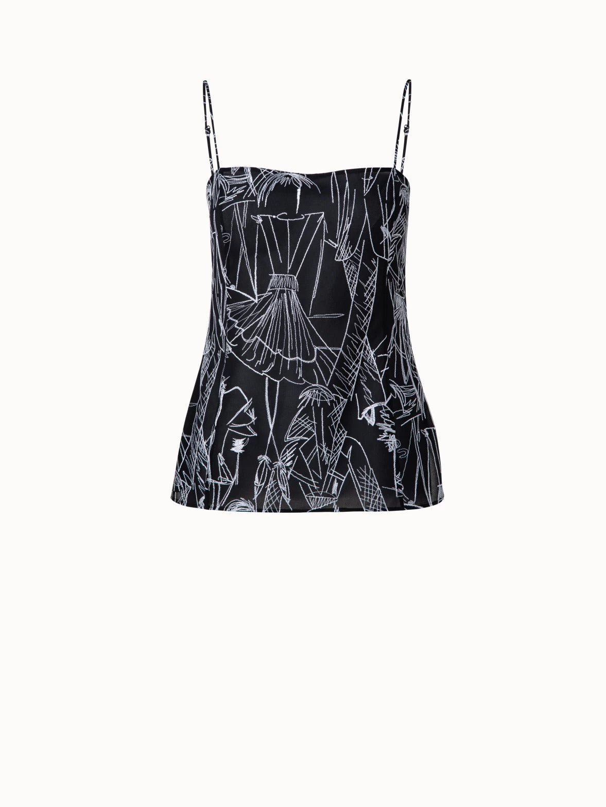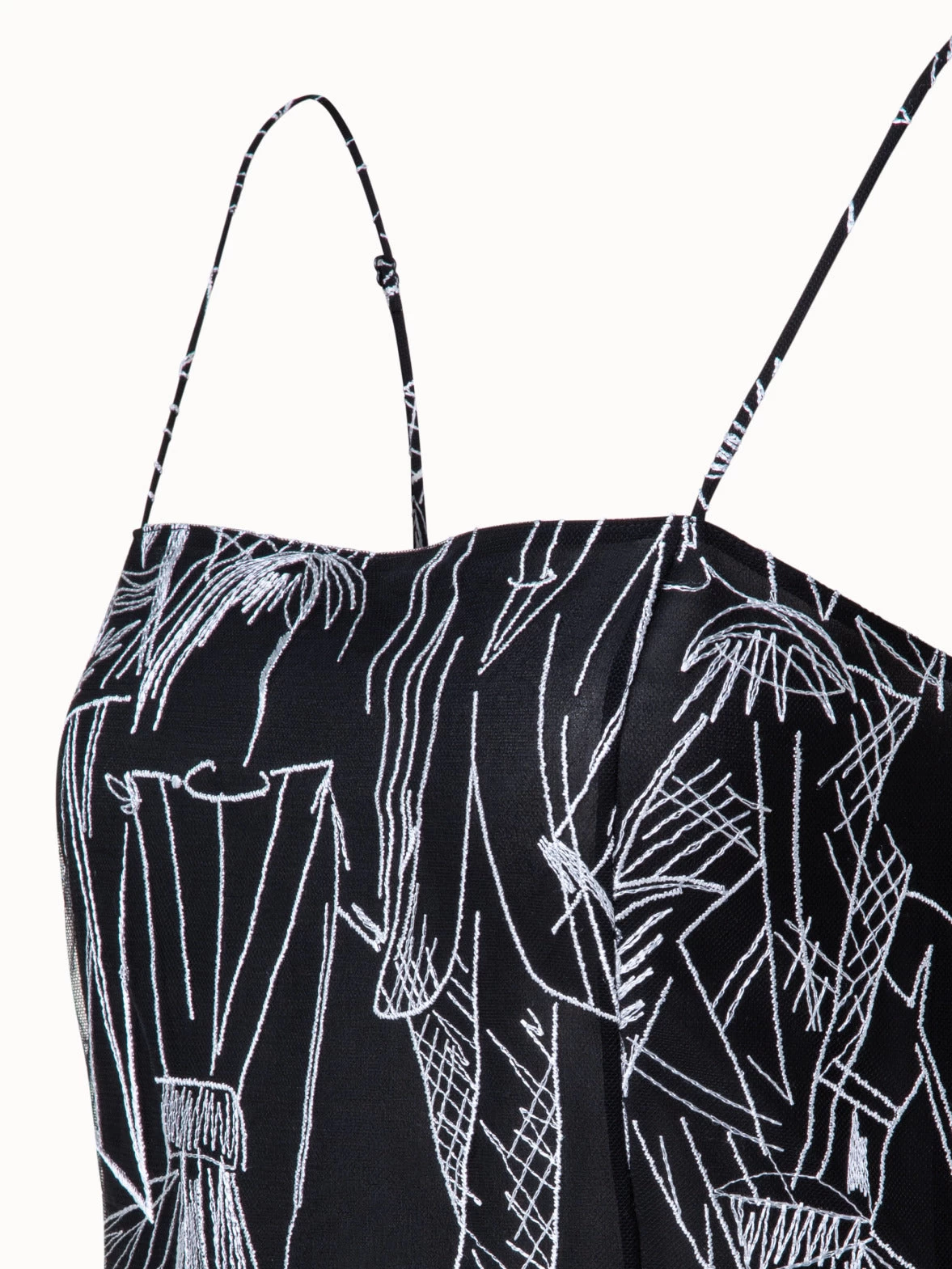 Using a lightweight techno tulle as the base for the embroidery, this spaghetti strap top embodies a modern, youthful look and fresh feel for summer days. “