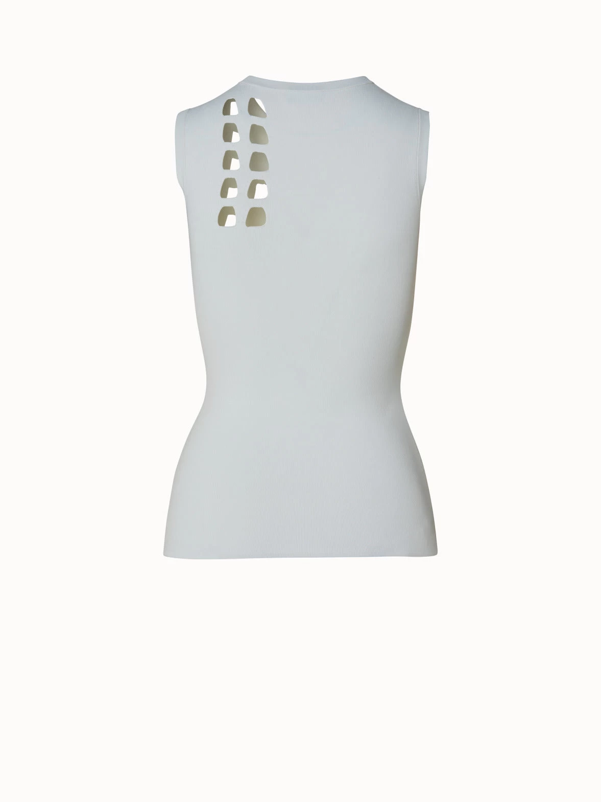 This Akris sleeveless knit pullover is designed with trapezoid cutouts around the decolleté, so they only reveal a hint of skin. It is crafted from viscose stretch that accentuates your silhouette and has a slim fit. The perfect partner for a night out paired with a simple style like Faralda pants or as a base for tailoring.