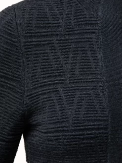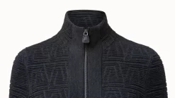 This cardigan knitted in wool silk stretch has an interesting trapezoid maze jacquard structure. The fitted shape features a stand up collar, double zip closure, slash pockets and long sleeves.