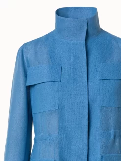 This Akris jacket Chianti is a modern field jacket style crafted in viscose cotton open weave. It features a stand-up collar and button closure. Patched pockets make it a functional item, while the drawstring waist allows for altering its silhouette and definition of the body.