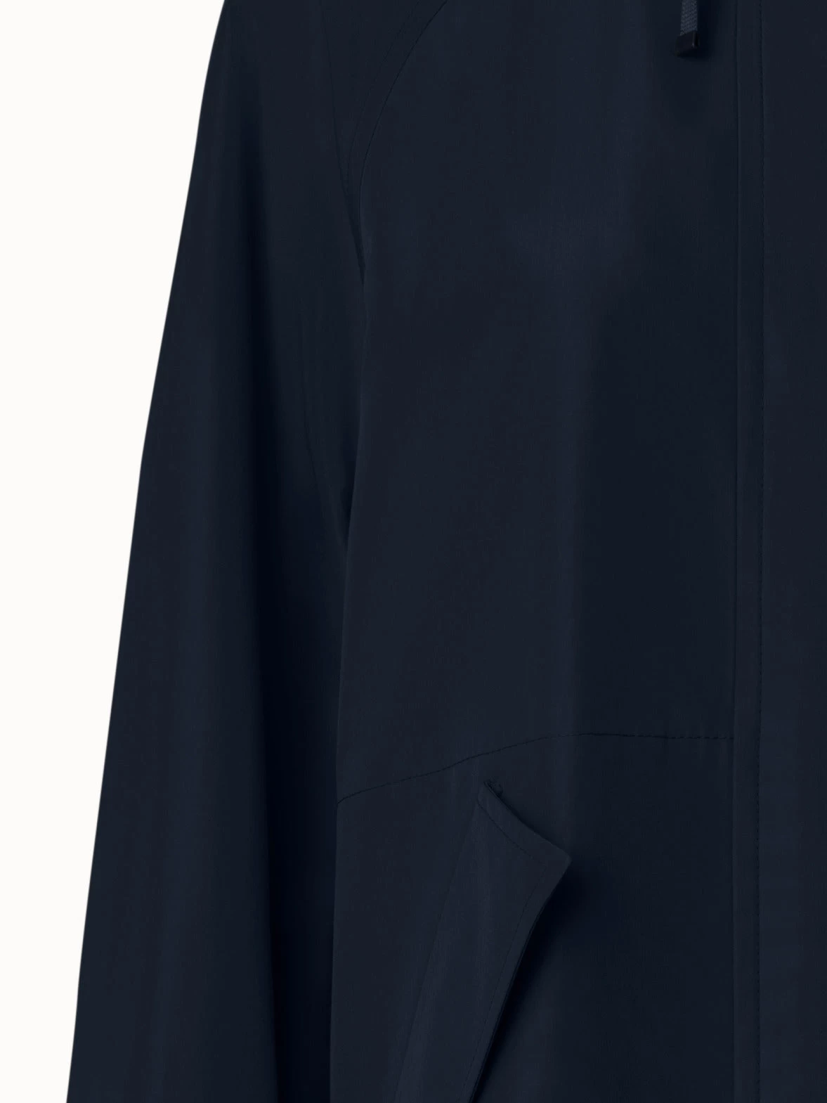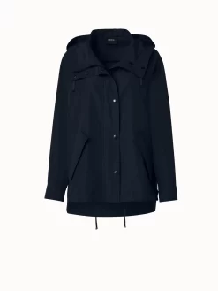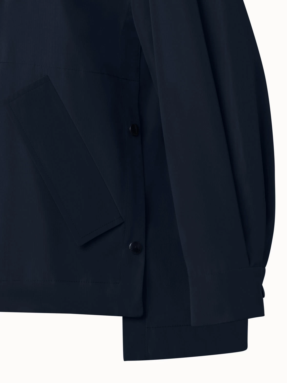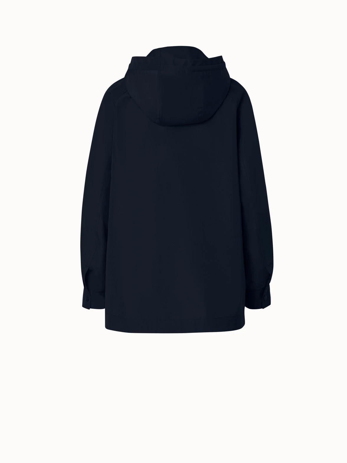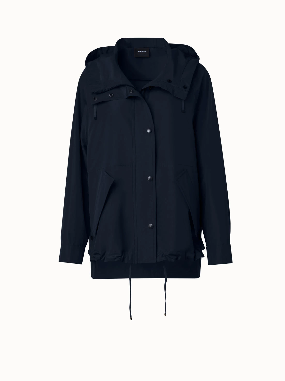 This Akris jacket Palina is crafted in waterproof Ventile® cotton, making it a sustainable outdoor style to protect you from the elements. This parka is cut for a slightly oversized fit with a longer back and snap buttons on the bottom of the side seams that can be opened to add volume and let in air. The front bottom seam and hood feature drawstrings to perfect the fit. The front zipper is hidden behind a snap button flap that keeps water out. Two pockets add additional functionality.