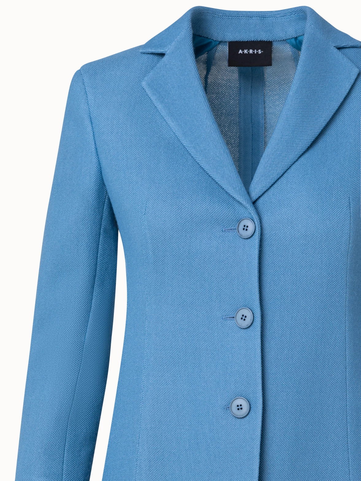 This Akris jacket Nat is crafted in a comfortable wool and cotton blend stretch piqué. The classic three-button design features an elegantly tailored lapel collar. Fine sleeve slits and seam pockets create a sleek look that will effortlessly take you from the office to the weekend. The light weight and breathability of the fabric make this a jacket a great choice all year round.