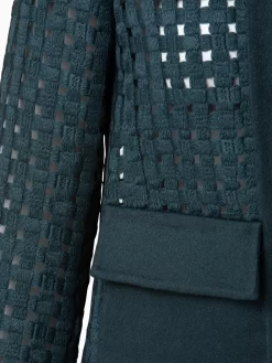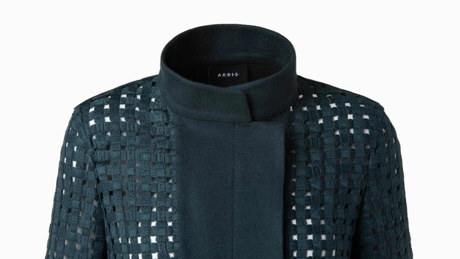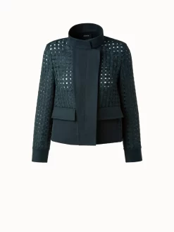 This moto-style embroidered jacket is the epitome of understated luxury. The body of the jacket is crafted in a wool open grid embroidery while the trim is finished in double face cashmere. The soft, relaxed shape layers easily over a seamless cashmere silk knit and can be dressed up or down.
