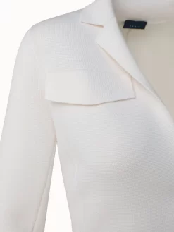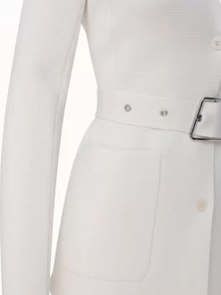 A comfortable item that fits any occasion, this lightweight knit blazer is a a great casual layering piece Features a lapel collar, patch pockets, front buttons, and a self-tie belt with a trapezoid buckle.