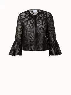The cutout leaves pattern on techno mesh beautifies this Akris punto faux leather boxy and feminine jacket. It features a round neck for easy styling, a front zip closure, useful side seam pockets, and bracelet sleeves finishing in flouncy cuffs. This is a versatile piece we consider to be foundational for any closet.
