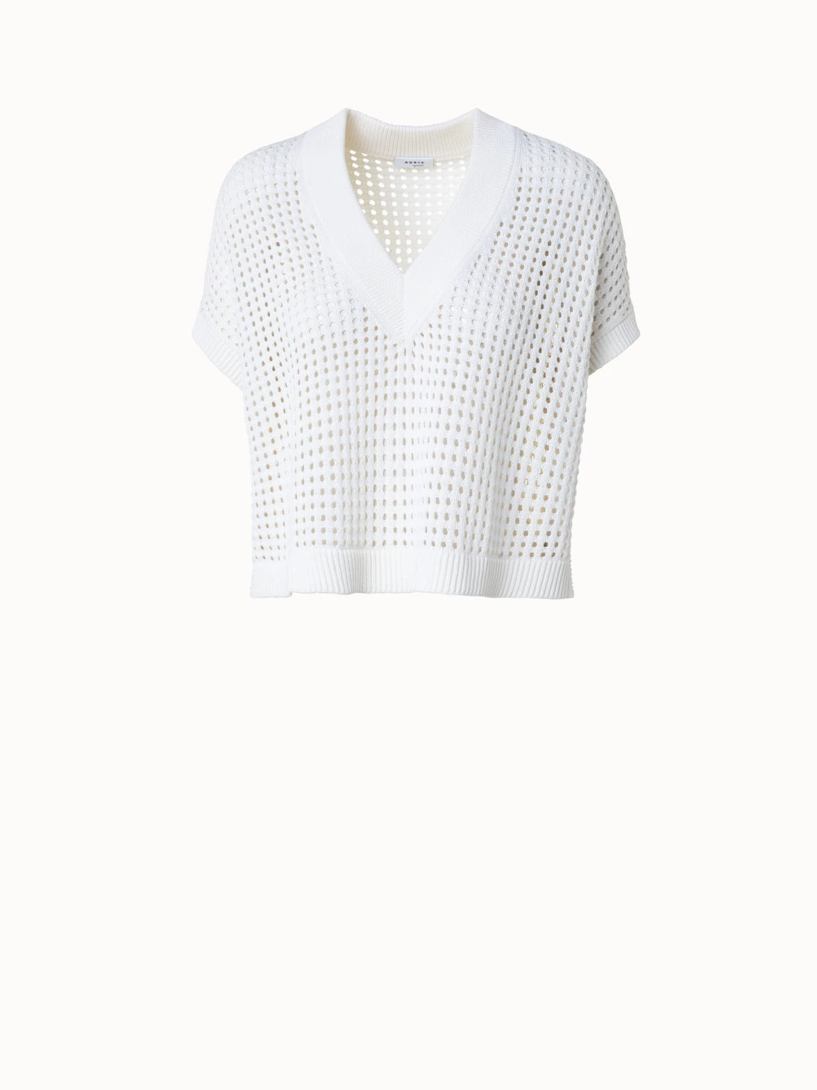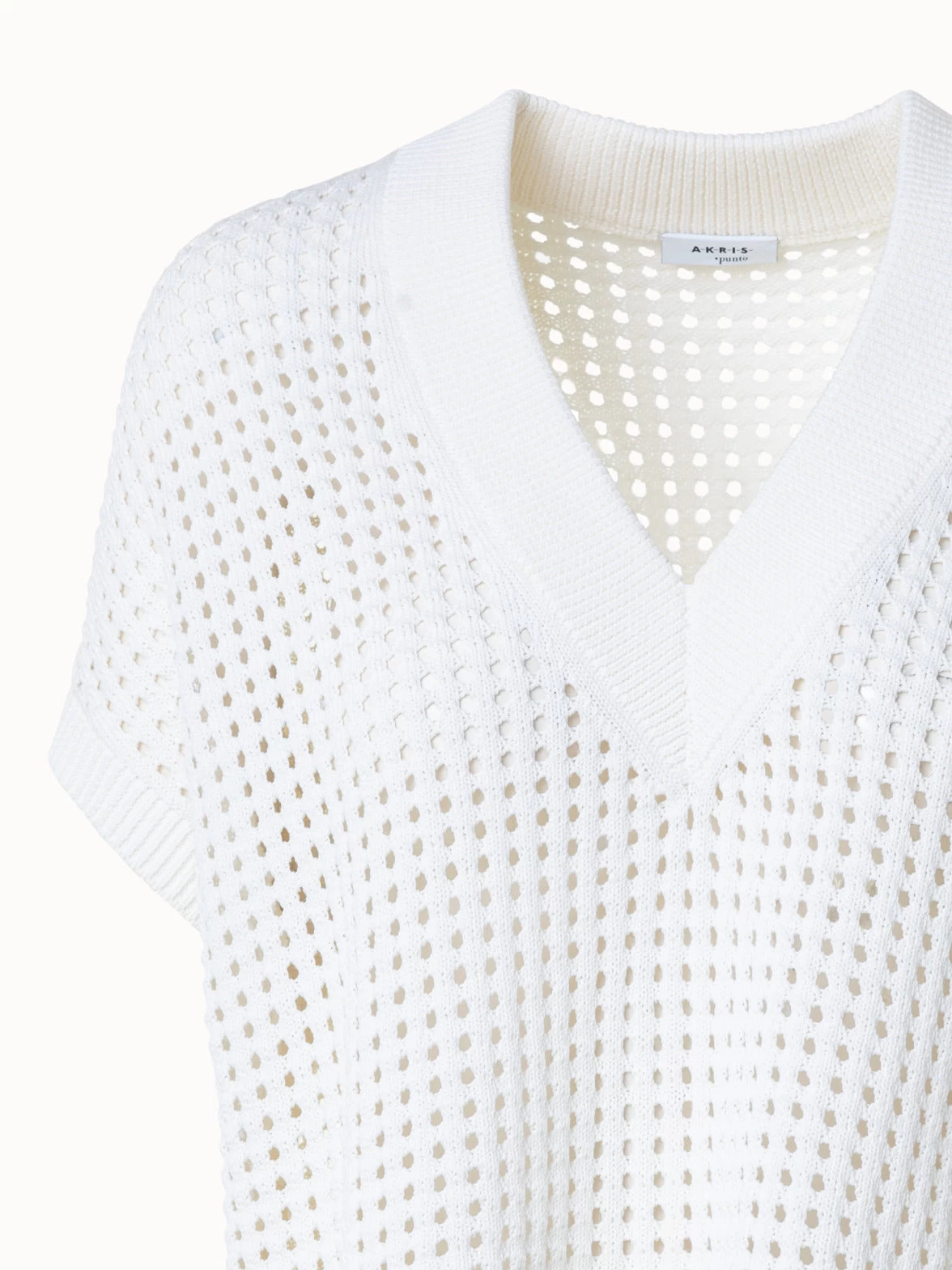 This Akris punto knit pullover is crafted in a chunky cotton dot mesh that creates a comfortable style with sensual transparency. It features a low V-neck and dropped shoulders with cap sleeves. Cut for a boxy fit.