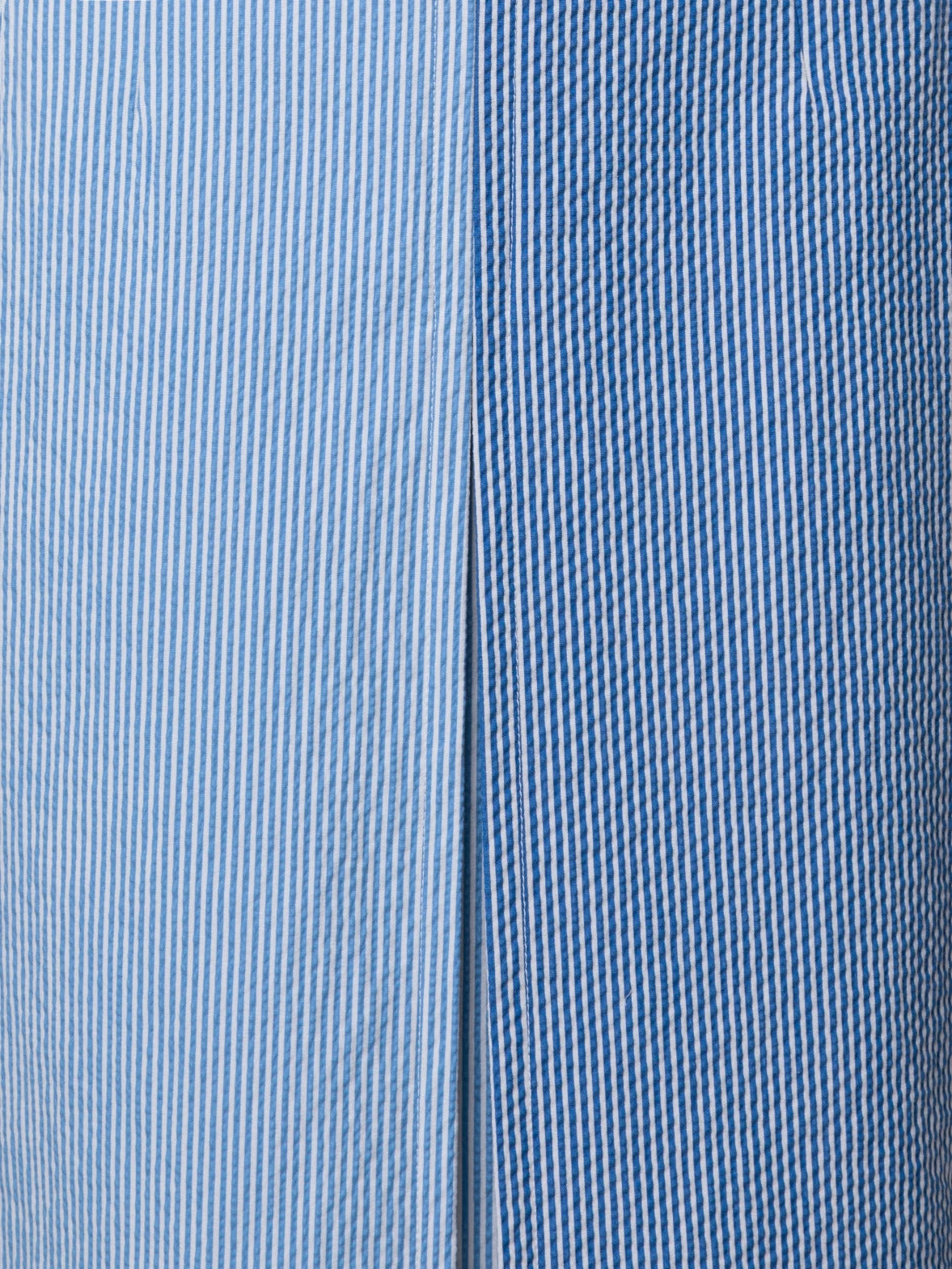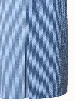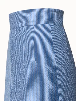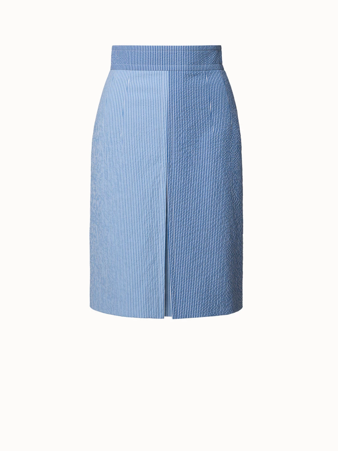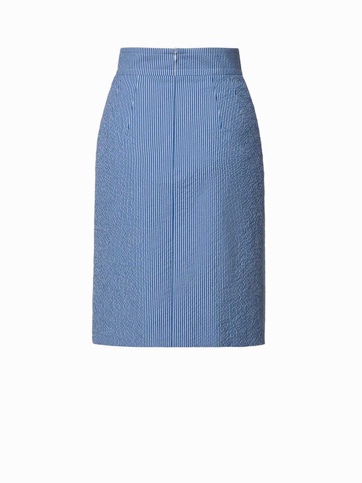 This Akris punto skirt is a versatile style for spring and summer. Crafted in striped cotton stretch seersucker, they are easily dressed up or down while ensuring comfort. This skirt are cut with an A-line and for a knee length. It features a waistband, front pleat, and closes with a back zip.