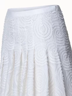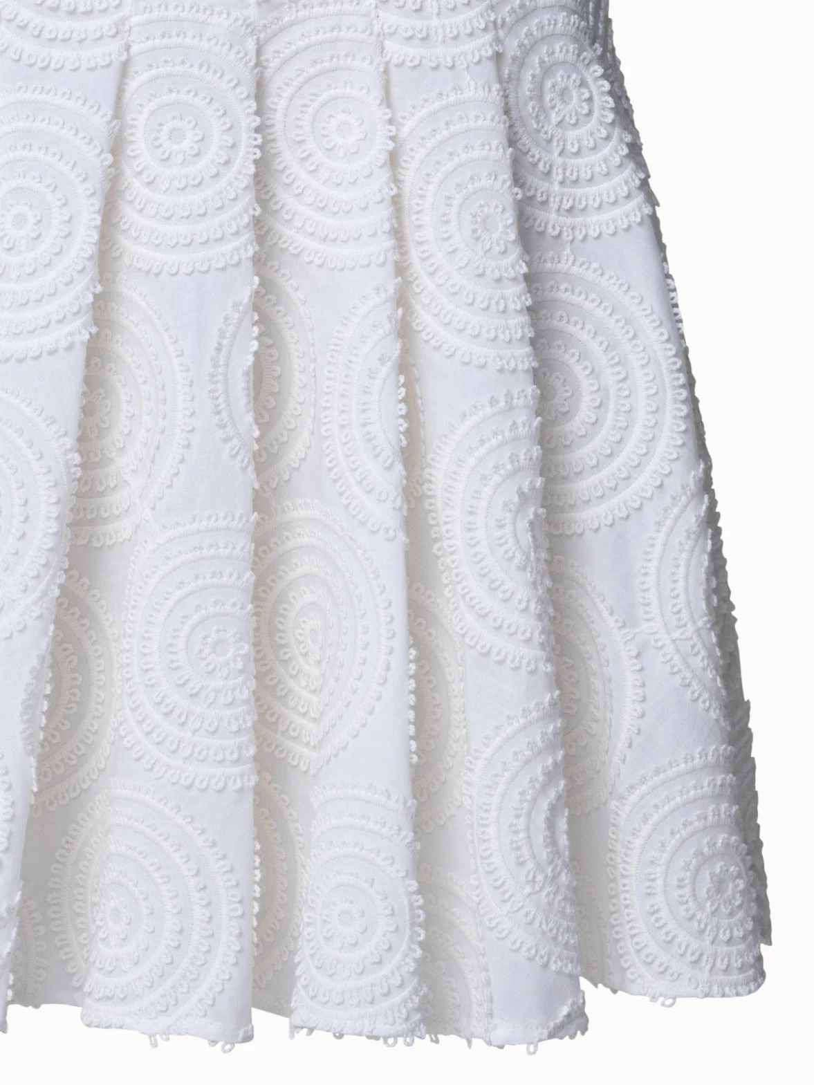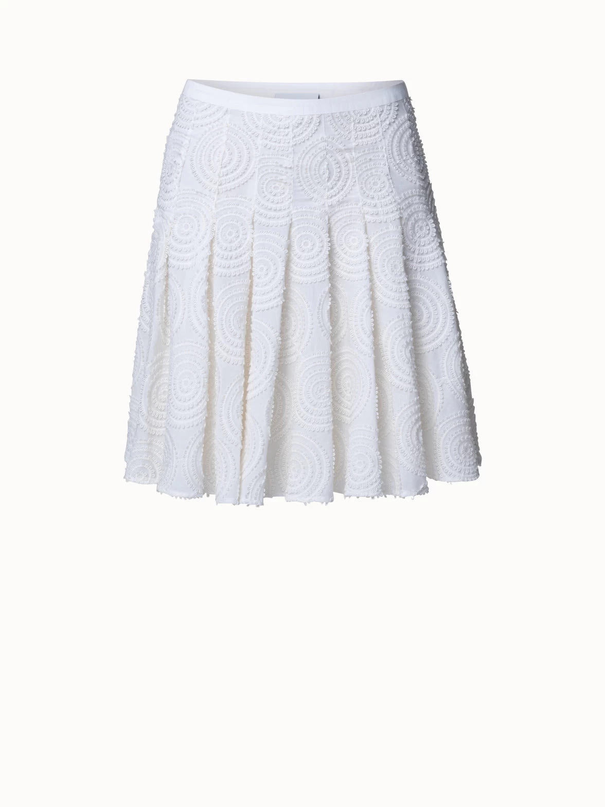 This Akris punto skirt is crafted in cotton batiste with circle loop embroidery, subtly showcasing the signature Akris punto dot. This short skirt is cut with a fitted upper part that moves into a flared section with pleats. Closes with a side zip.