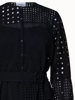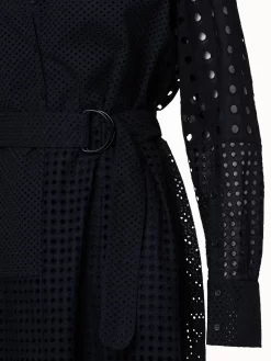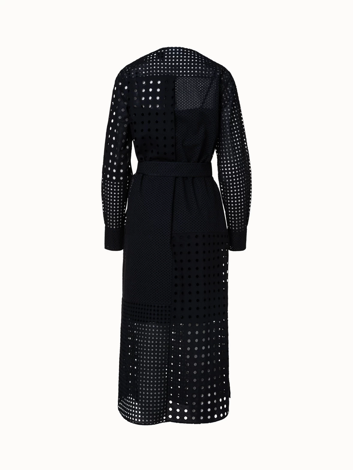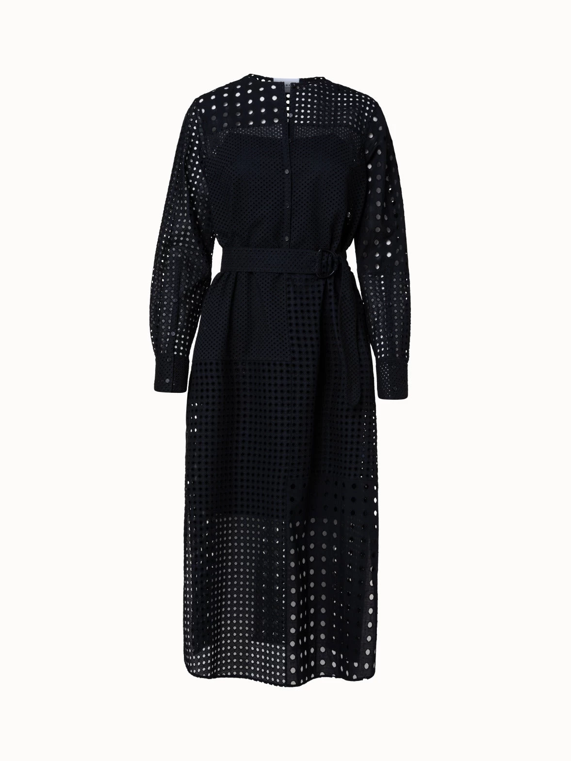 This Akris punto tunic dress is crafted in a patchwork of several sizes of eyelet embroidery on cotton. It features a round neck with a front button placket. Side seam pockets add functionality, while side slits allow for easy movement in this midi-length silhouette. A back pleat underlines the airy feeling of the style. Includes a fabric belt that adds shape to this dress. Comes with a slip dress.