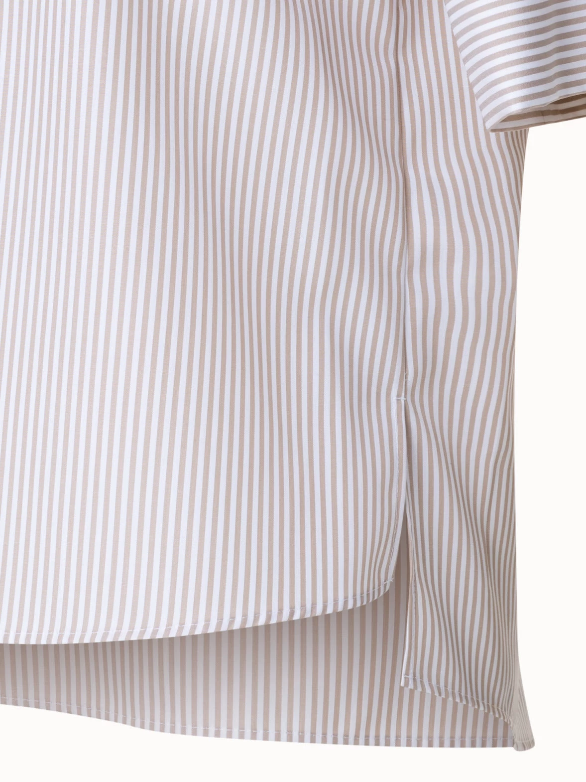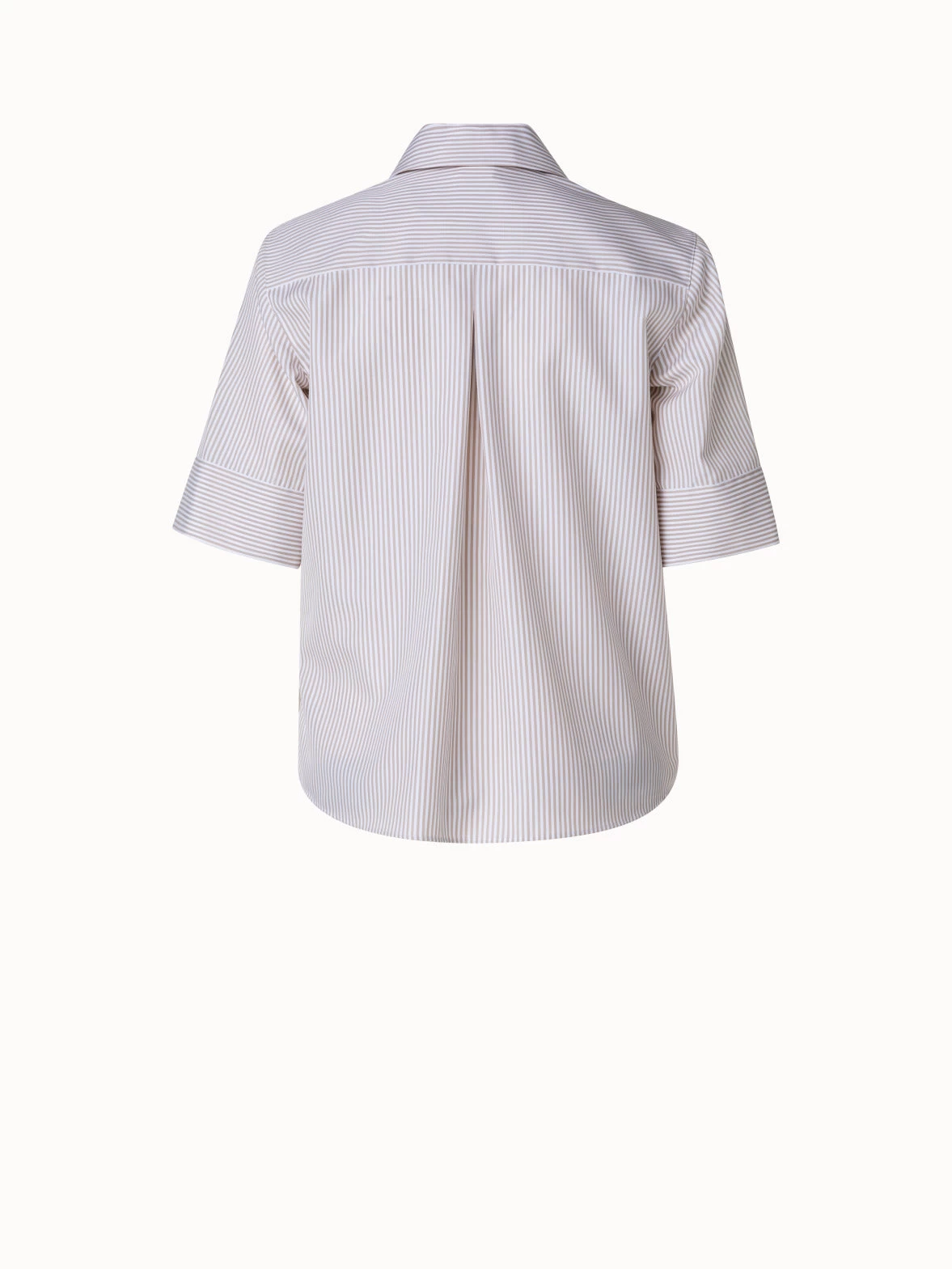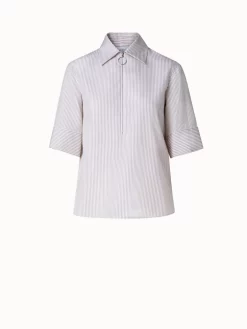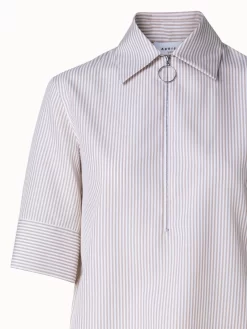 This Akris punto blouse is crafted in striped cotton poplin. It is cut in an A-line silhouette that is accentuated by the back pleat. Half sleeves create airy volume. Features a spread collar and half zip.