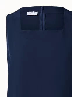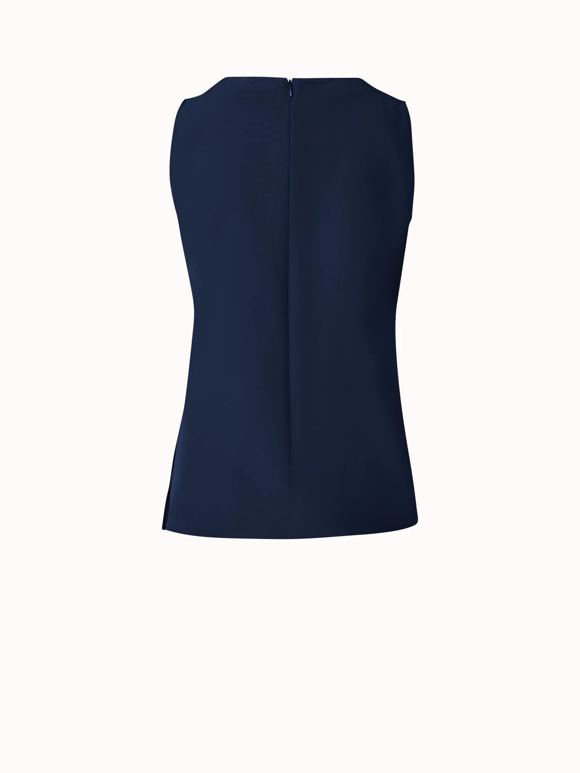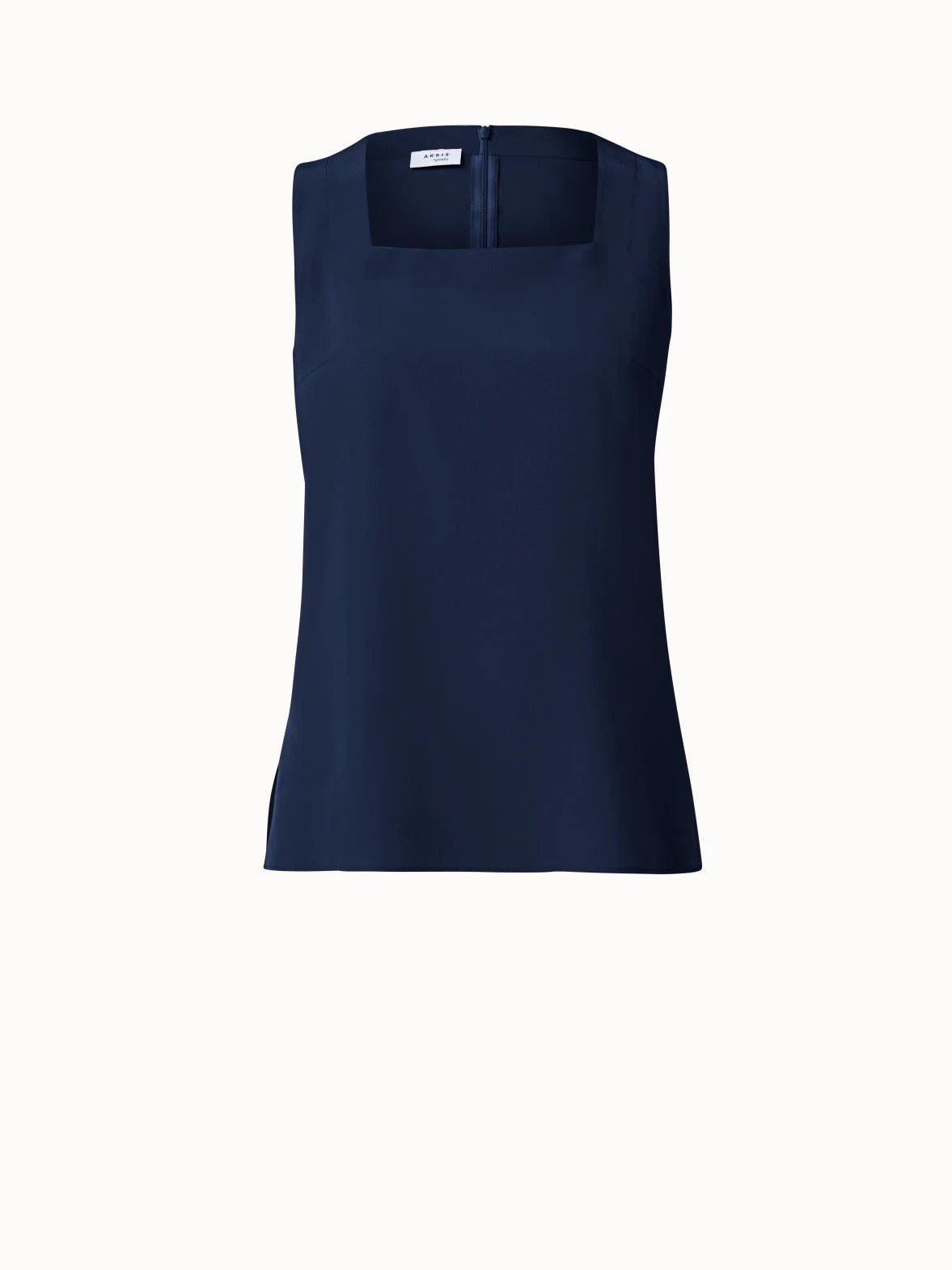 This sleeveless Akris punto blouse is crafted in an elegant crêpe de chine. It features a square neck, side slits, and elongated back hem, creating a sleek silhouette.