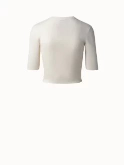 Cropped cardigan in virgin wool with round neck, one snap closure and halfsleeve.