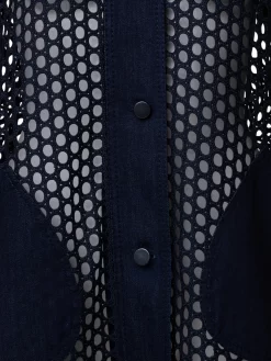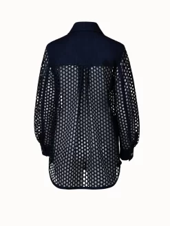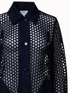 This Akris punto shirt jacket is a lightweight mixed-media design perfect for the warm-weather season. It is crafted in a dot mesh techno guipure embroidery with washed denim xl patched pockets, collar, cuffs, button placket, and shoulder panel that create structure. The oversized silhouette and back yoke add to the airiness of this design.
