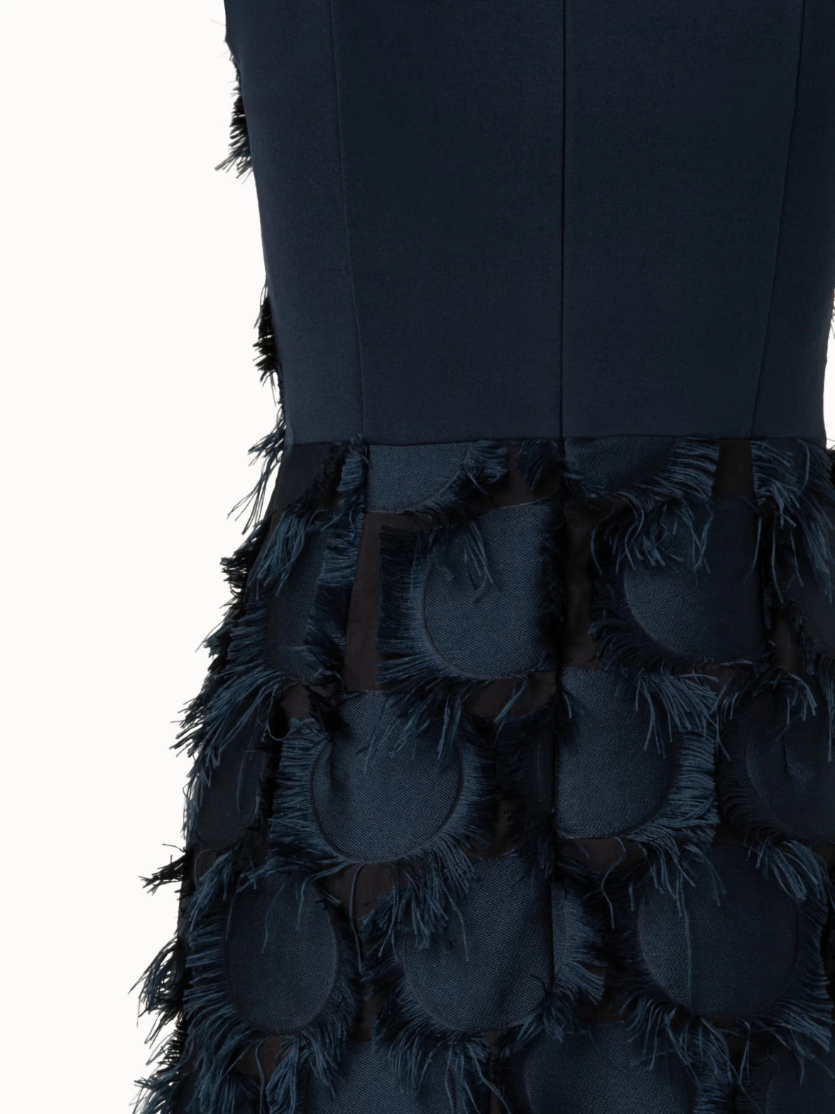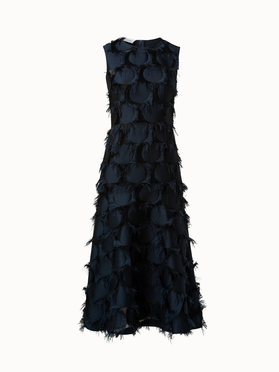 This Akris punto midi dress is crafted in a fringed dot fil coupé, making it a true stand-out piece. The plain back panel hugs the body, while the front and skirt create elegant volume through the fabric. The dress is cut with a fitted top and flared skirt. It features a back zip closure with signature punto puller, and includes a slip dress.