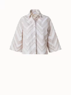 This Akris punto blouse is crafted in a lively fringed zigzag cotton blend jacquard. The box shape and wide 3/4 sleeves create a modern silhouette. Features a kent collar and concealed button closure.