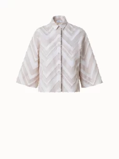 This Akris punto blouse is crafted in a lively fringed zigzag cotton blend jacquard. The box shape and wide 3/4 sleeves create a modern silhouette. Features a kent collar and concealed button closure.