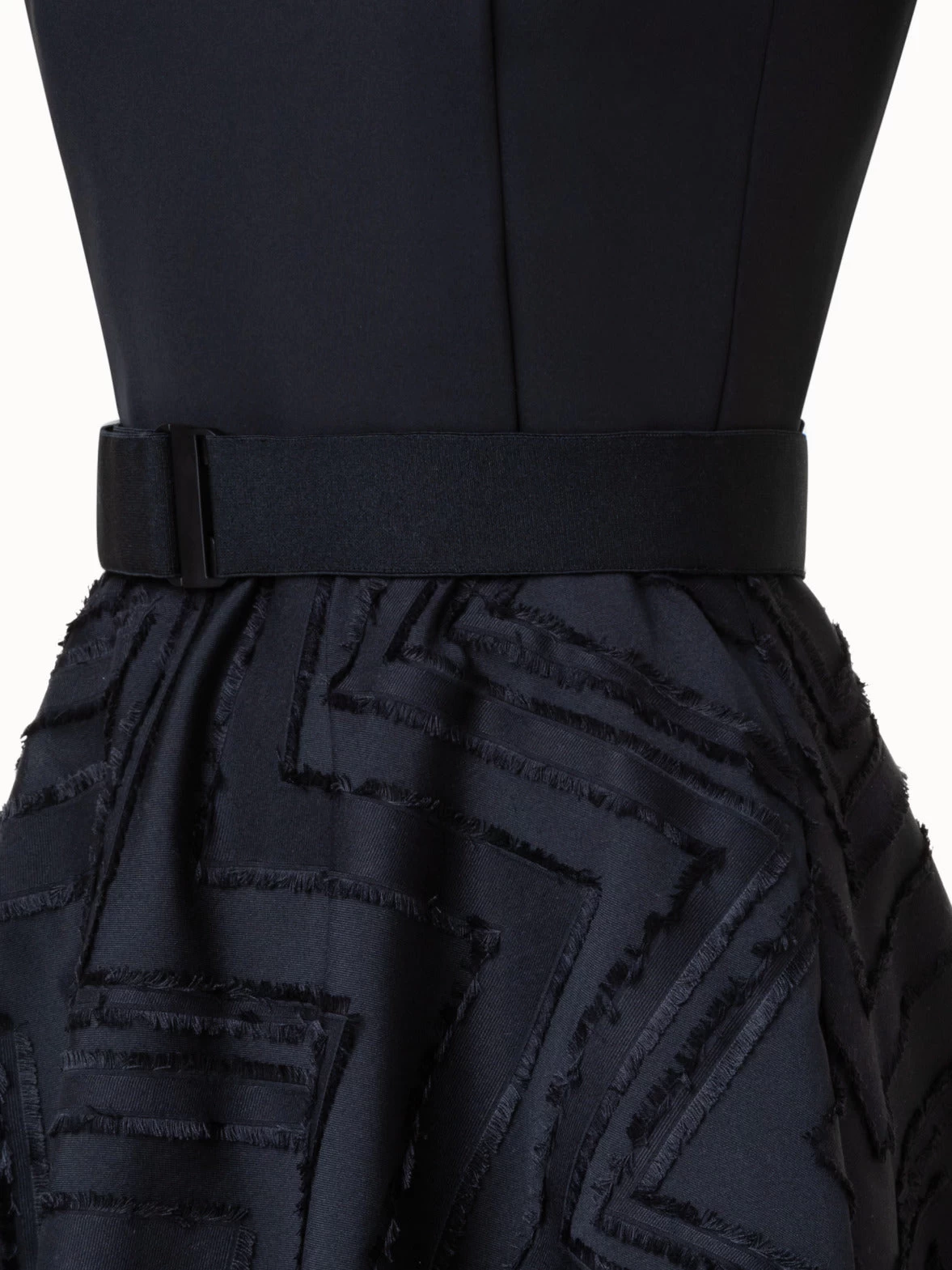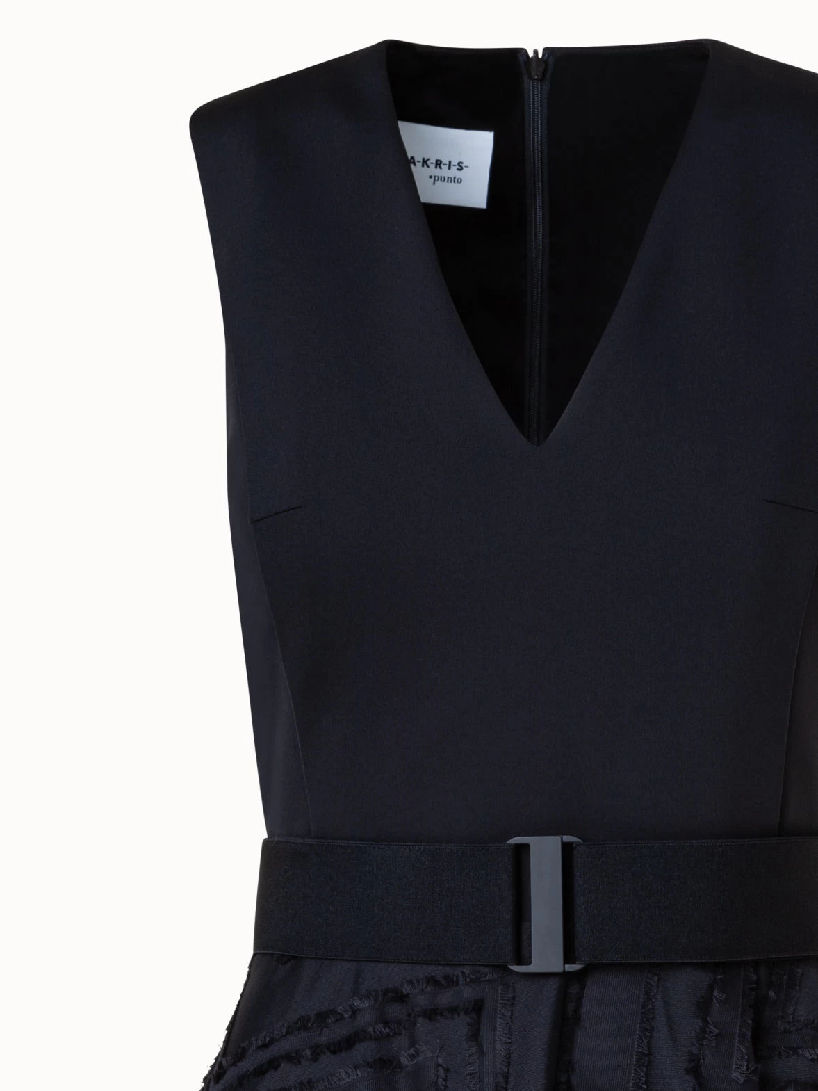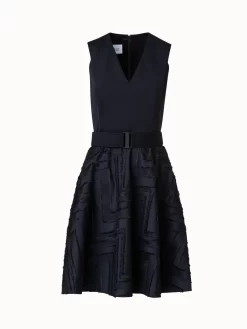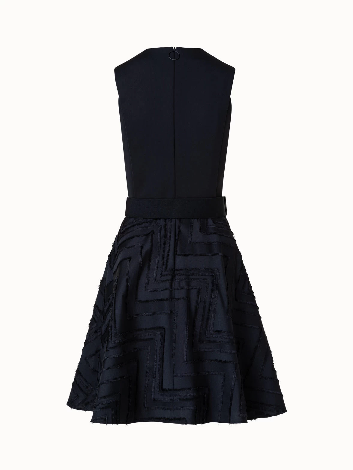 This Akris punto dress combines a sleek cotton jersey top with a skirt in lively fringed zigzag cotton blend jacquard. The fitted bodice and flared skirt create a flattering silhouette. Closes with a back zip.