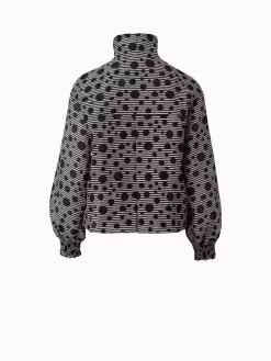 This Akris punto jacket is crafted in a semi-transparent techno organdy with jacquard dots, ideal for adding a light layer. It has a boxy fit that is accentuated by the A-line cut and back pleat. The jacket has a stand-up collar, front button closure, smocked sleeve cuffs, and patch pockets.