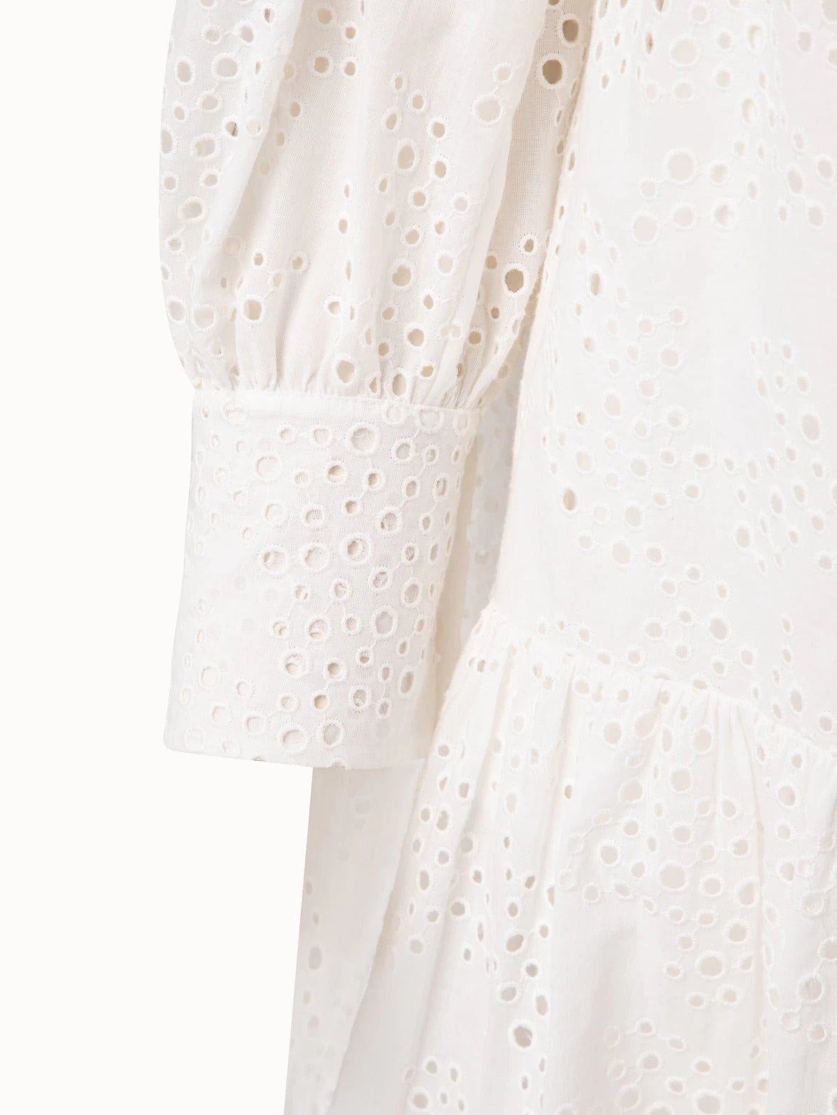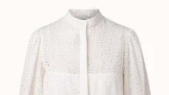 This Akris punto knee-length dress is crafted from Tropical Leaves eyelet embroidery and enhanced by a mandarin collar and concealed front button closure. The cut is straight with gathered long sleeves, puff cuffs, and a voluminous back. The skirt features a teared hem that will move beautifully in a breeze during summer. Additionally, the side seam pockets are a practical detail.