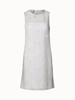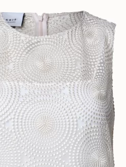 This Akris punto dress is crafted in metallic 3D dot embroidery on tulle, creating a shimmering lightweight silhouette. It features a straight cut with a flounce hem in the back. Side slits enable easy movement in this knee-length dress. Closes with a back zip. Includes a slip dress.