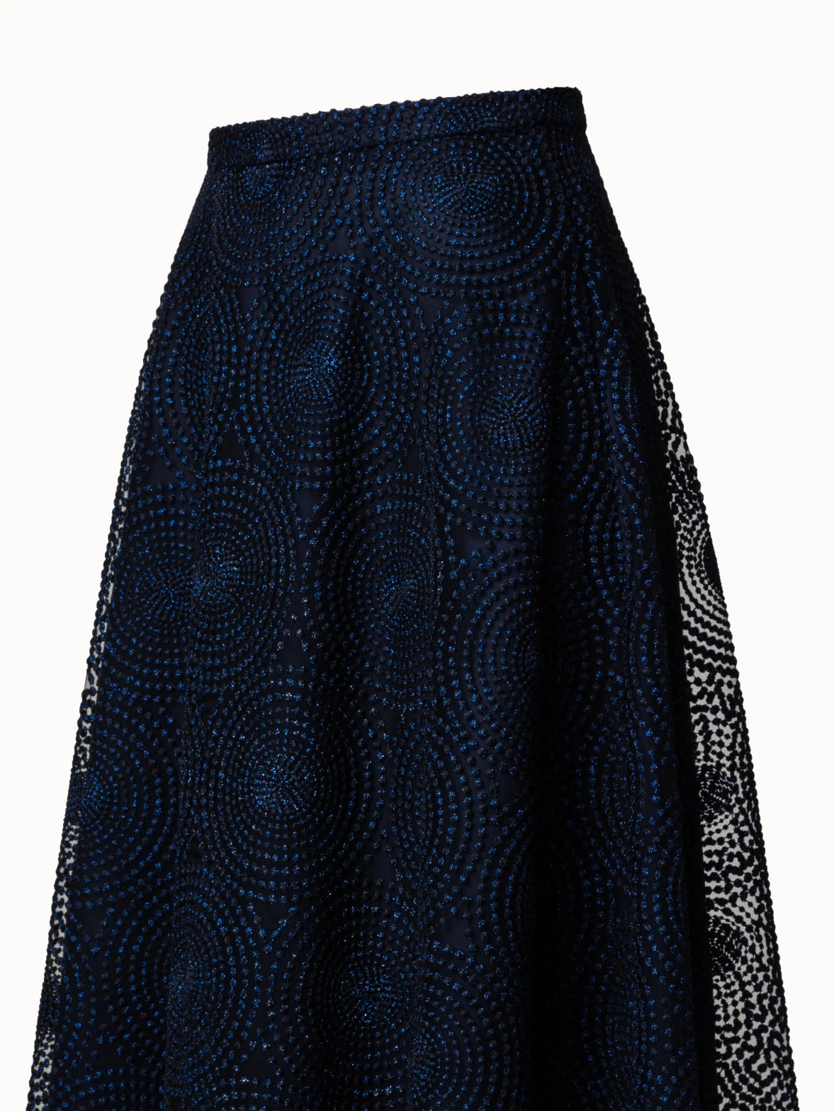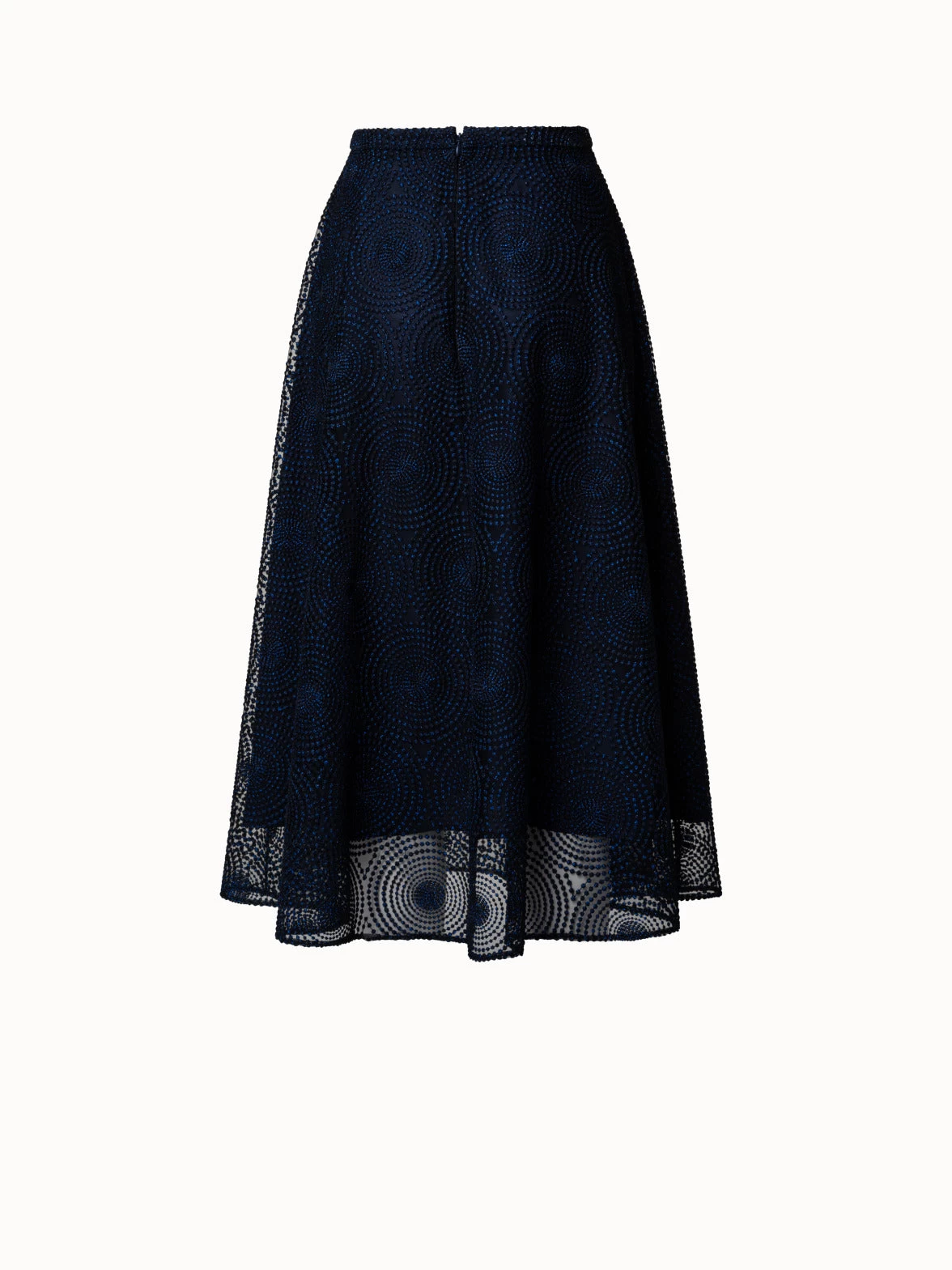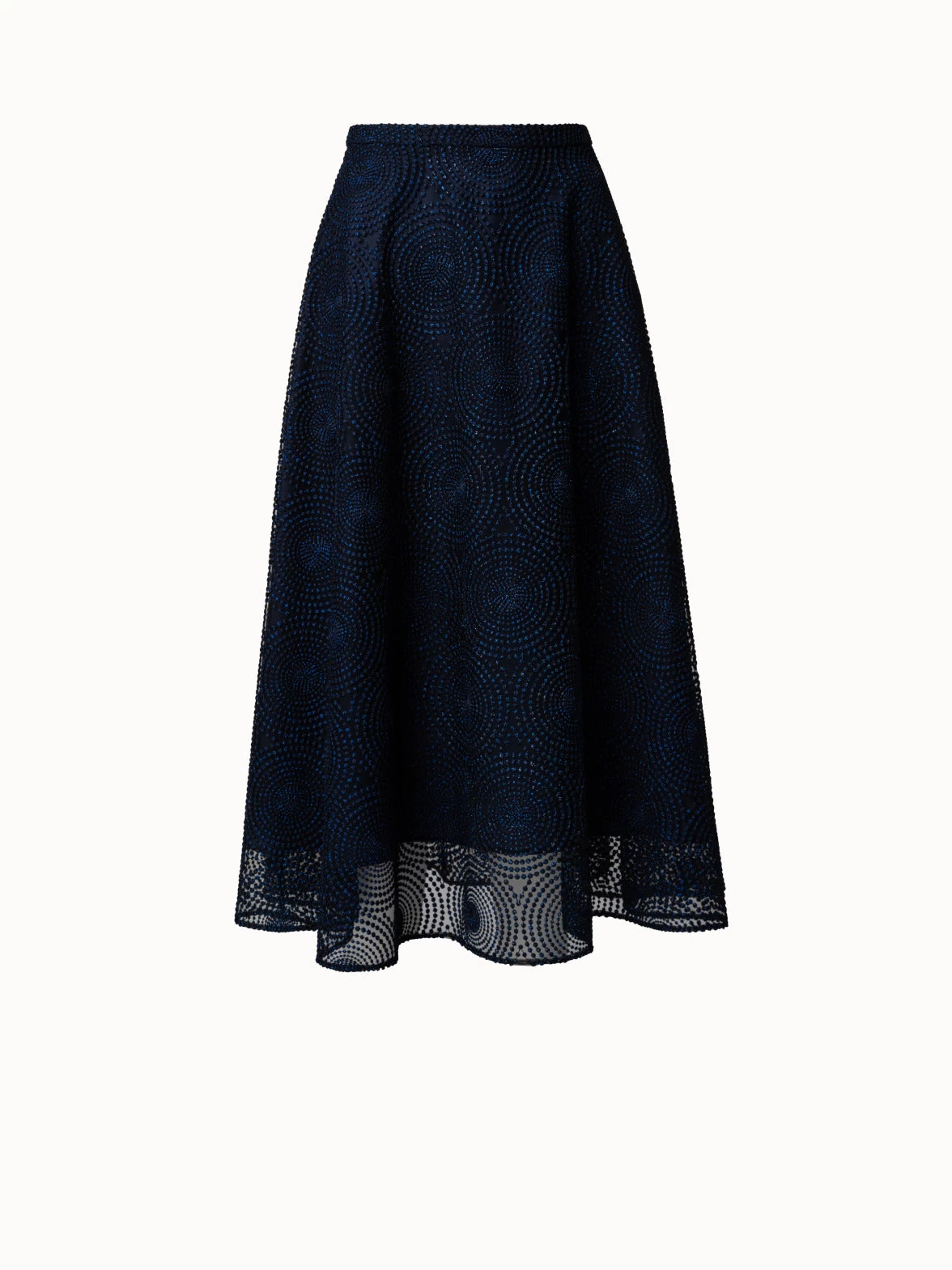 This Akris punto midi skirt is crafted in metallic 3D dot embroidery on tulle, creating a shimmering lightweight silhouette with beautiful movement. This skirt is cut for a flared shape. It features a waistband and back zip closure.