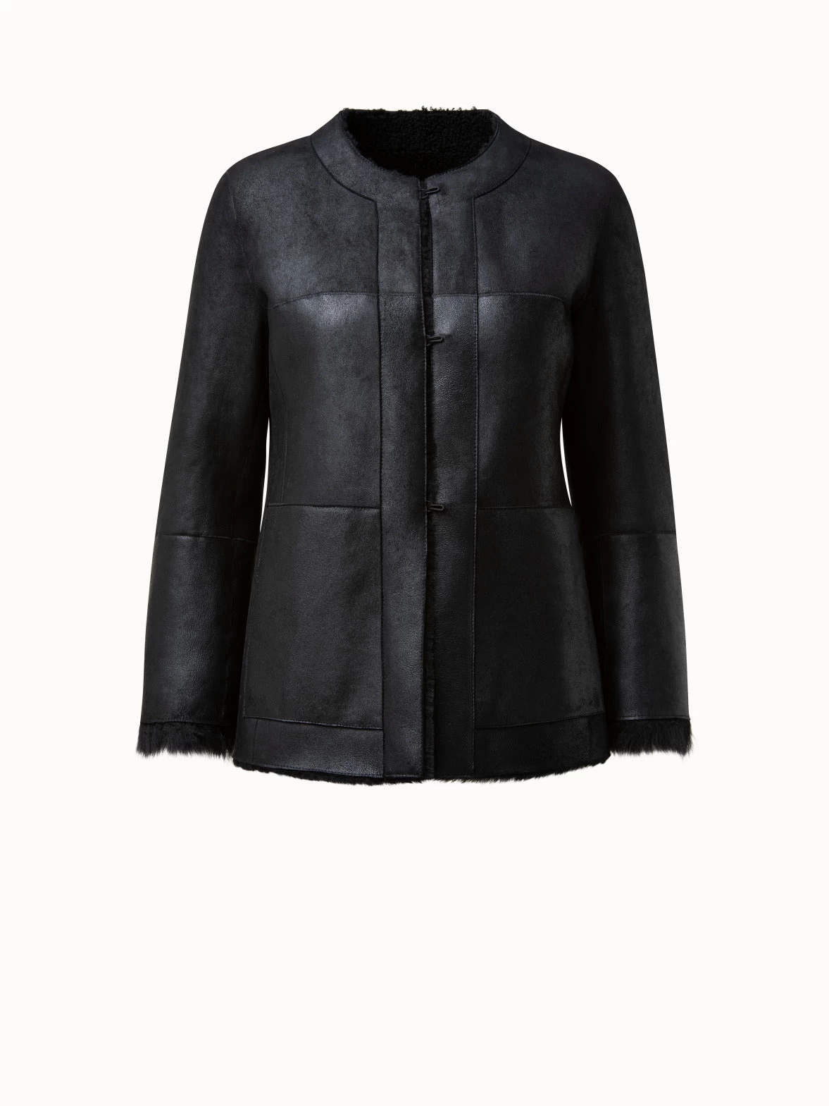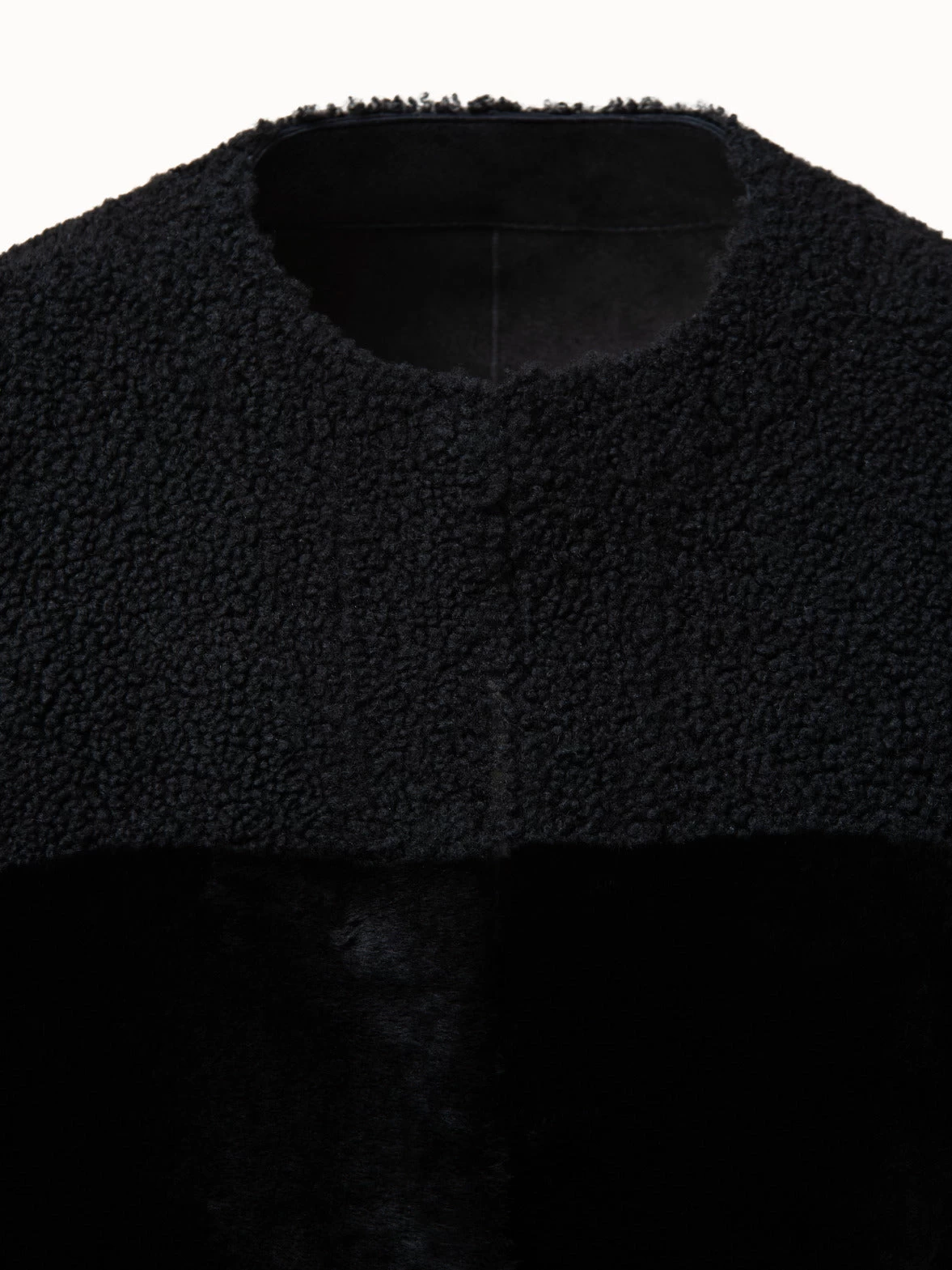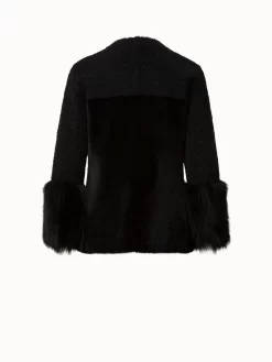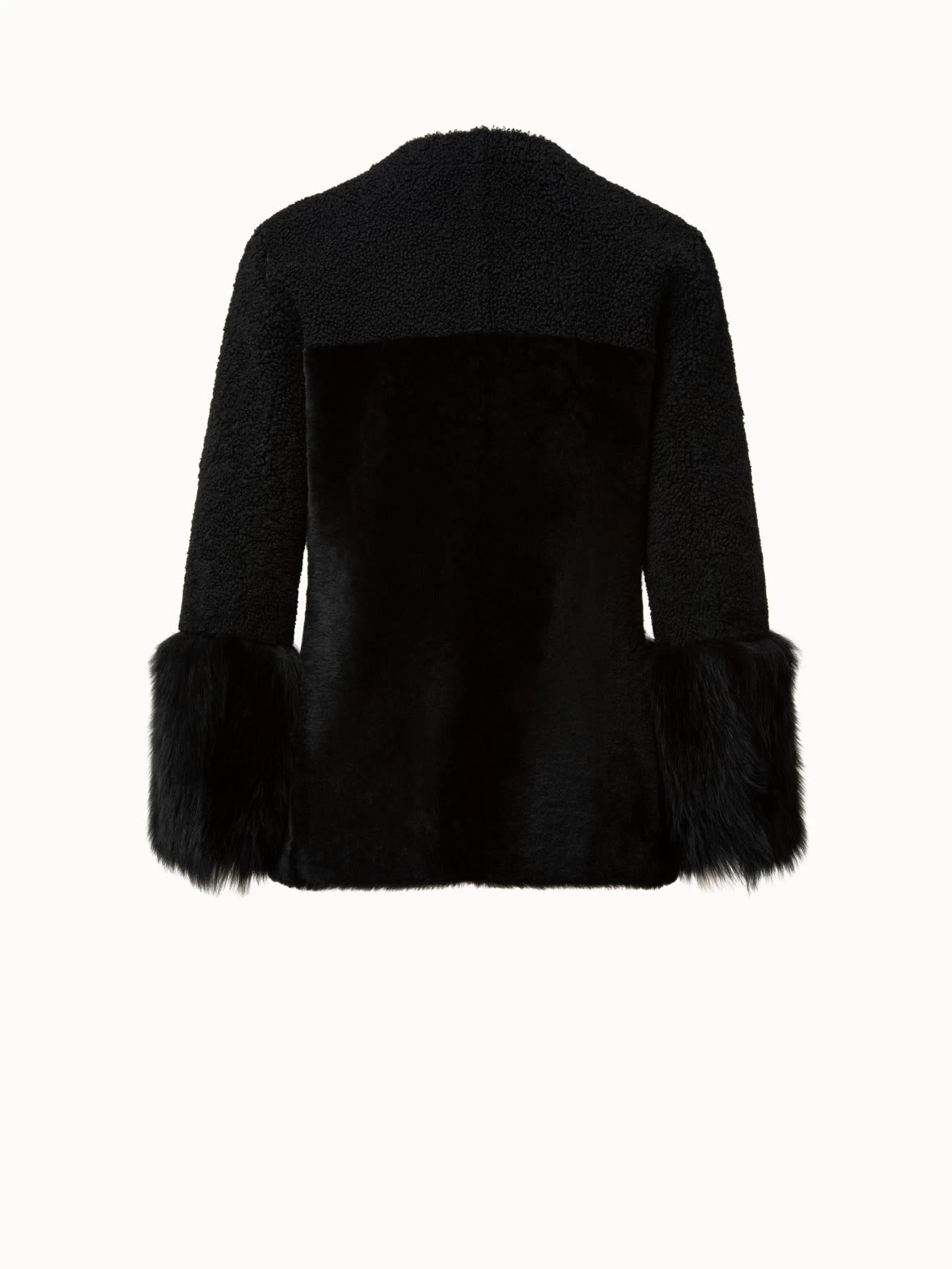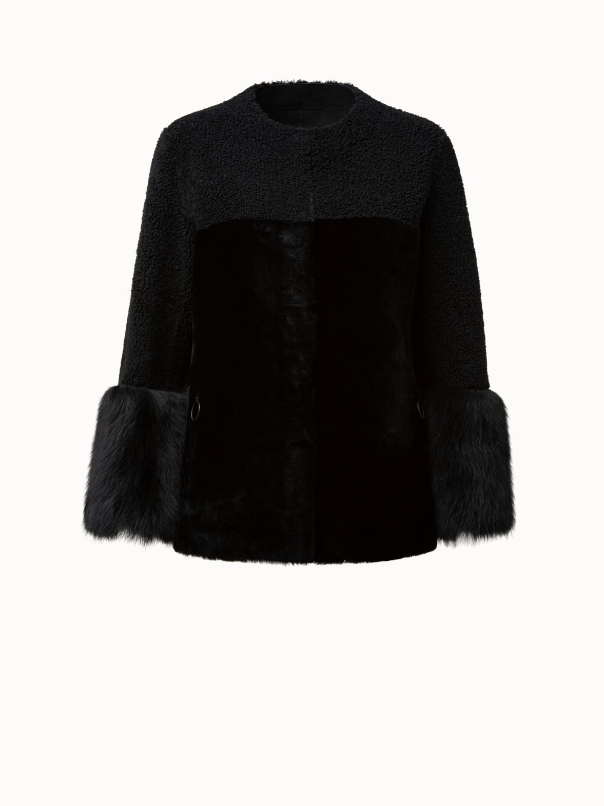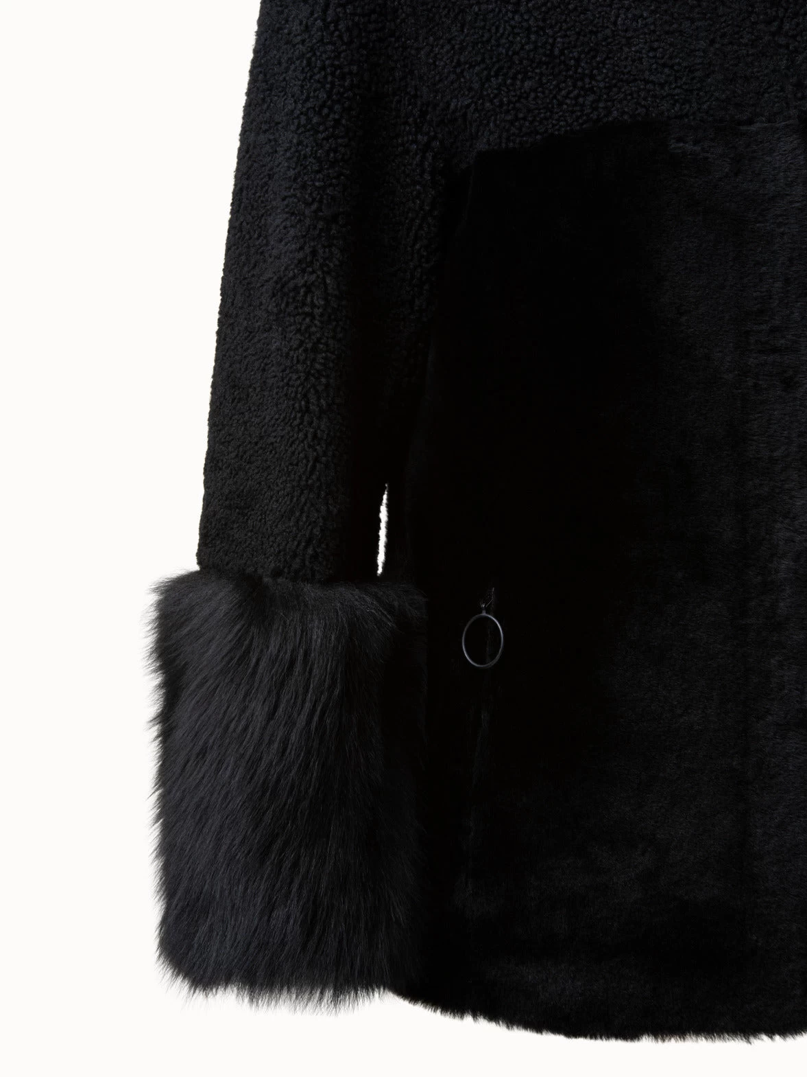 This beautiful fur jacket is made from three types of shearling: short curly Merino on the shoulders and sleeves, polished shiny finishing for the central body part, and long Toscana for voluminous cuffs. Throw it over your evening dress to complete your outstanding look.