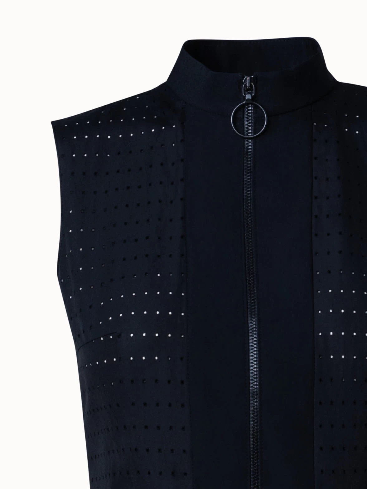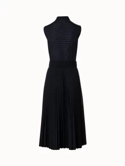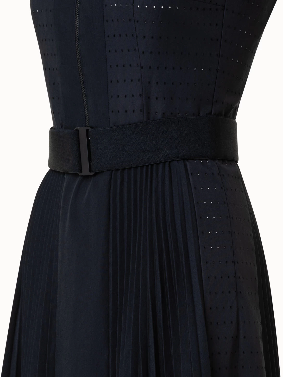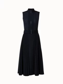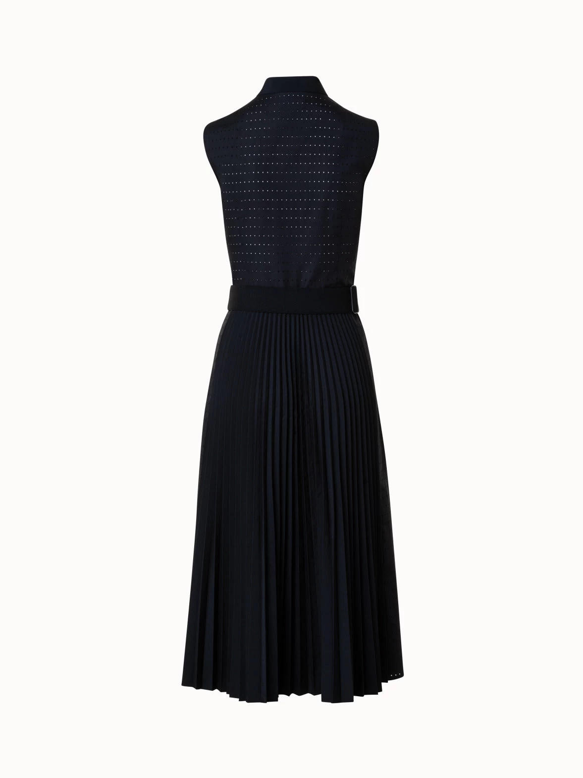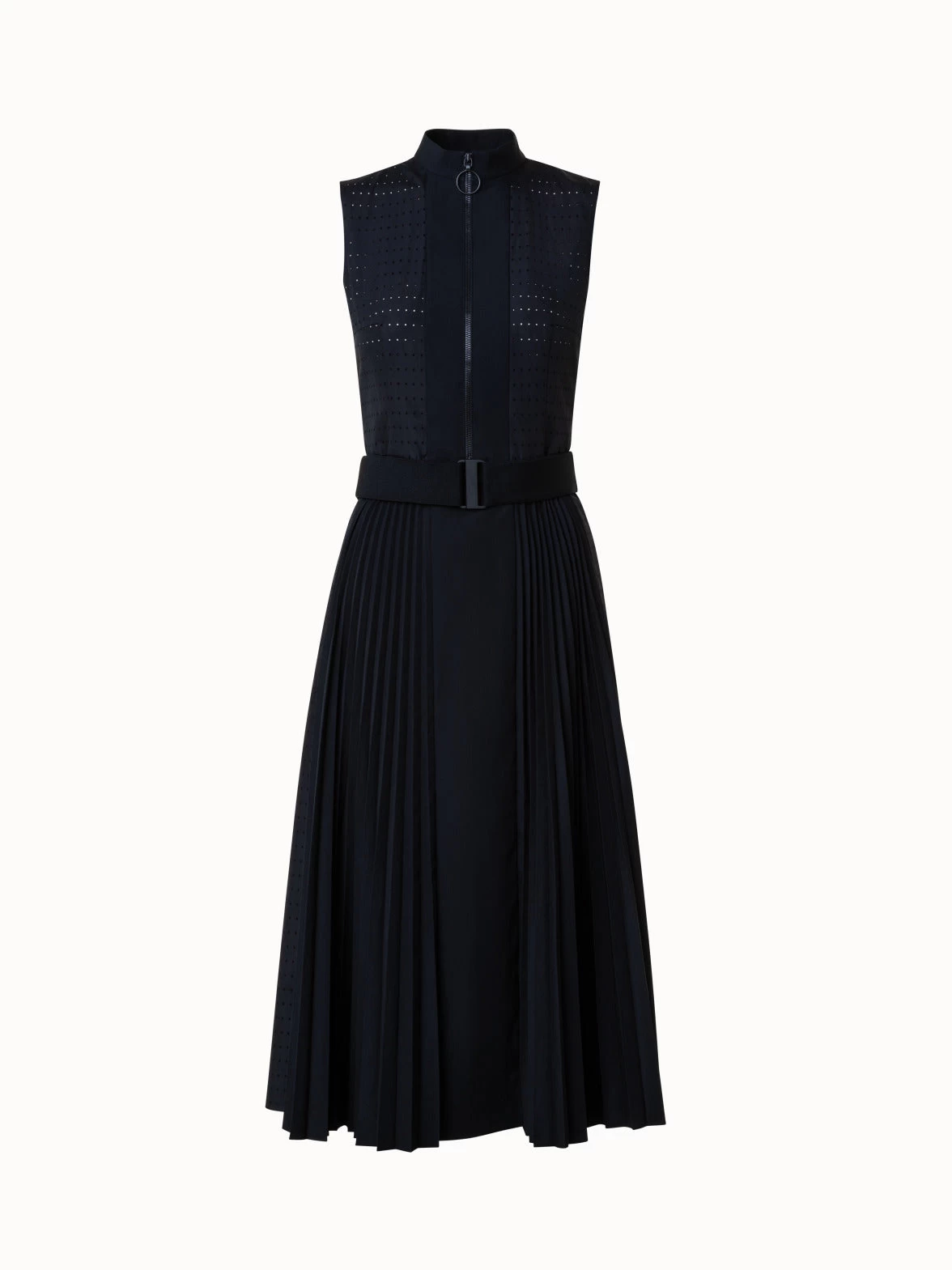 vThis Akris punto midi dress is crafted in a lightweight cotton poplin with pin dot perforations that create an airy feeling and subtly play with transparency. The sunray plissée skirt creates a beautiful flow and structure. The sleek mandarin collar with front zip closure allows for a versatile neckline. The included elastic belt accentuates the waist.
