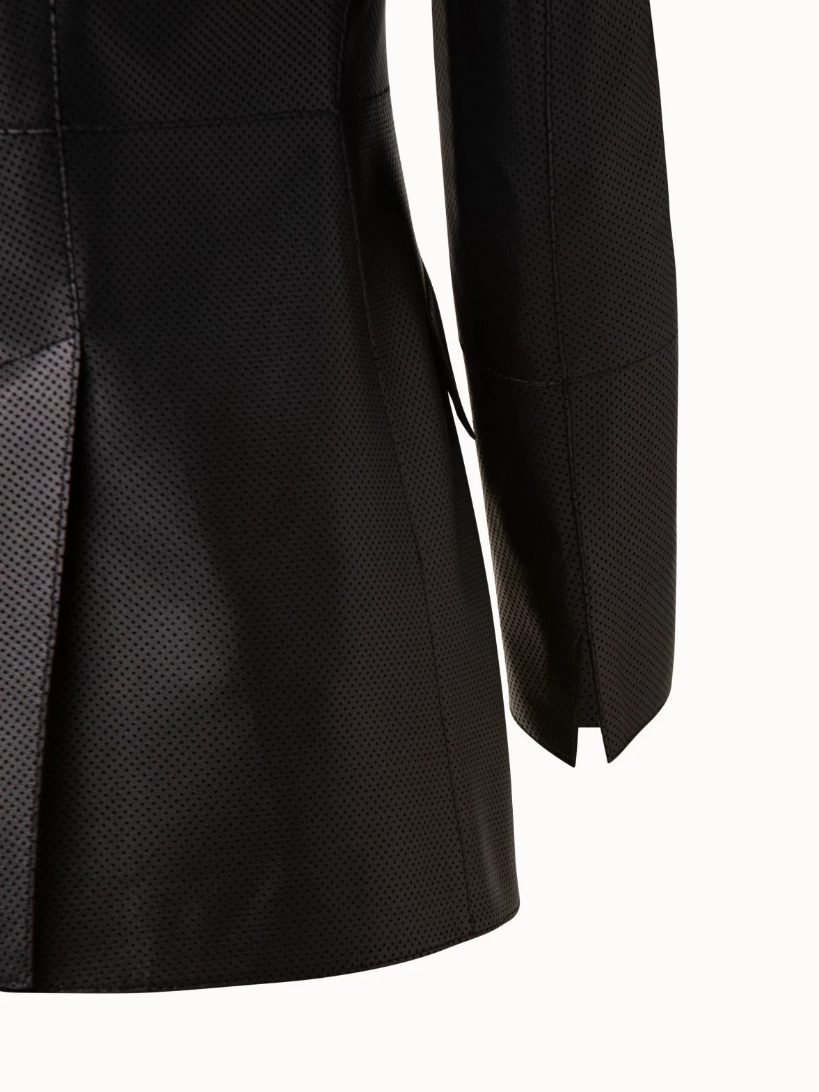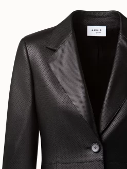 This Akris punto blazer is crafted in perforated pin dot Nappa leather. It is cut in a classic length and for a fitted silhouette. It features a lapel collar, two-button closure, and slanted flap pockets.