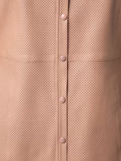 This Akris punto blouse is crafted from soft nappa leather that has subtle pin dot perforations. It is cut in a tailored fit, and features a Kent collar and a tonal snap button closure.