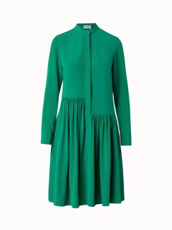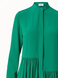 This Akris punto shirt dress is crafted in lightweight silk crêpe de chine, making it a perfect summer style. It features a mandarin collar and polo button closure that allows for variety in the neckline. The asymmetrical waistline and A-line circle skirt create a playful look and flowing movement.