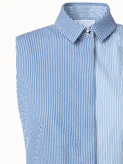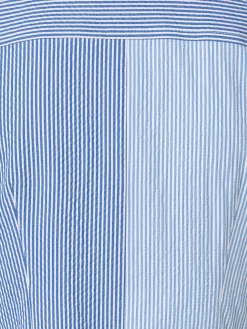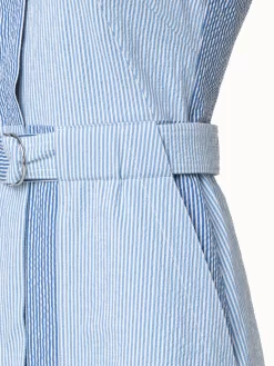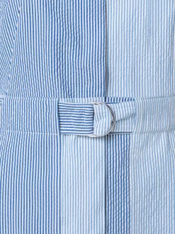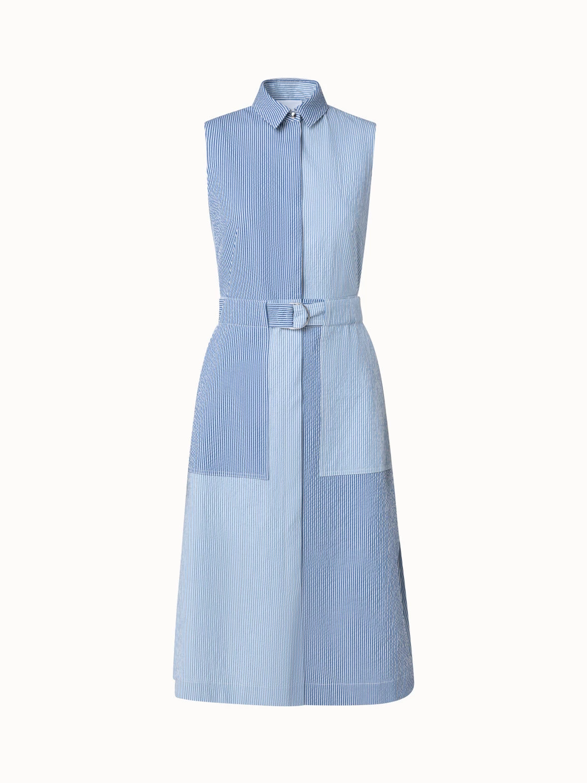 This lightweight midi dress is crafted in a patchwork of striped cotton seersucker that will keep you cool and stylish on hot summer days. The sleeveless silhouette features a spread collar, concealed button placket, and a matching belt to cinch your waist for more definition. The slightly A-line skirt is breezy and creates movement as you walk.