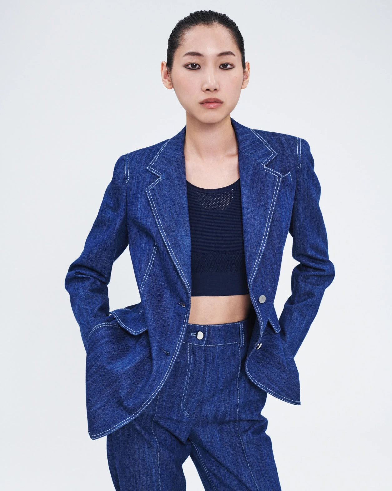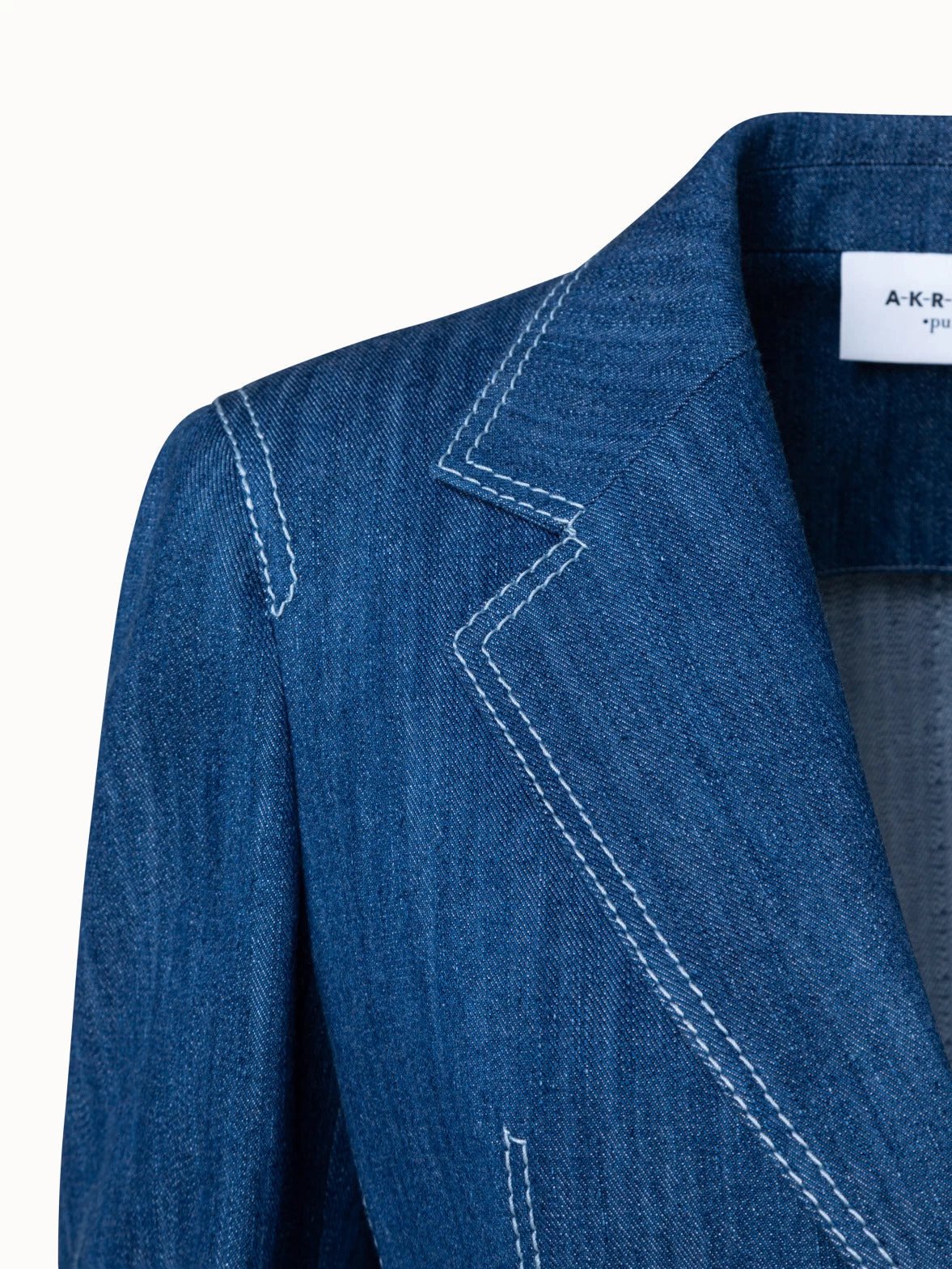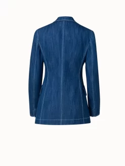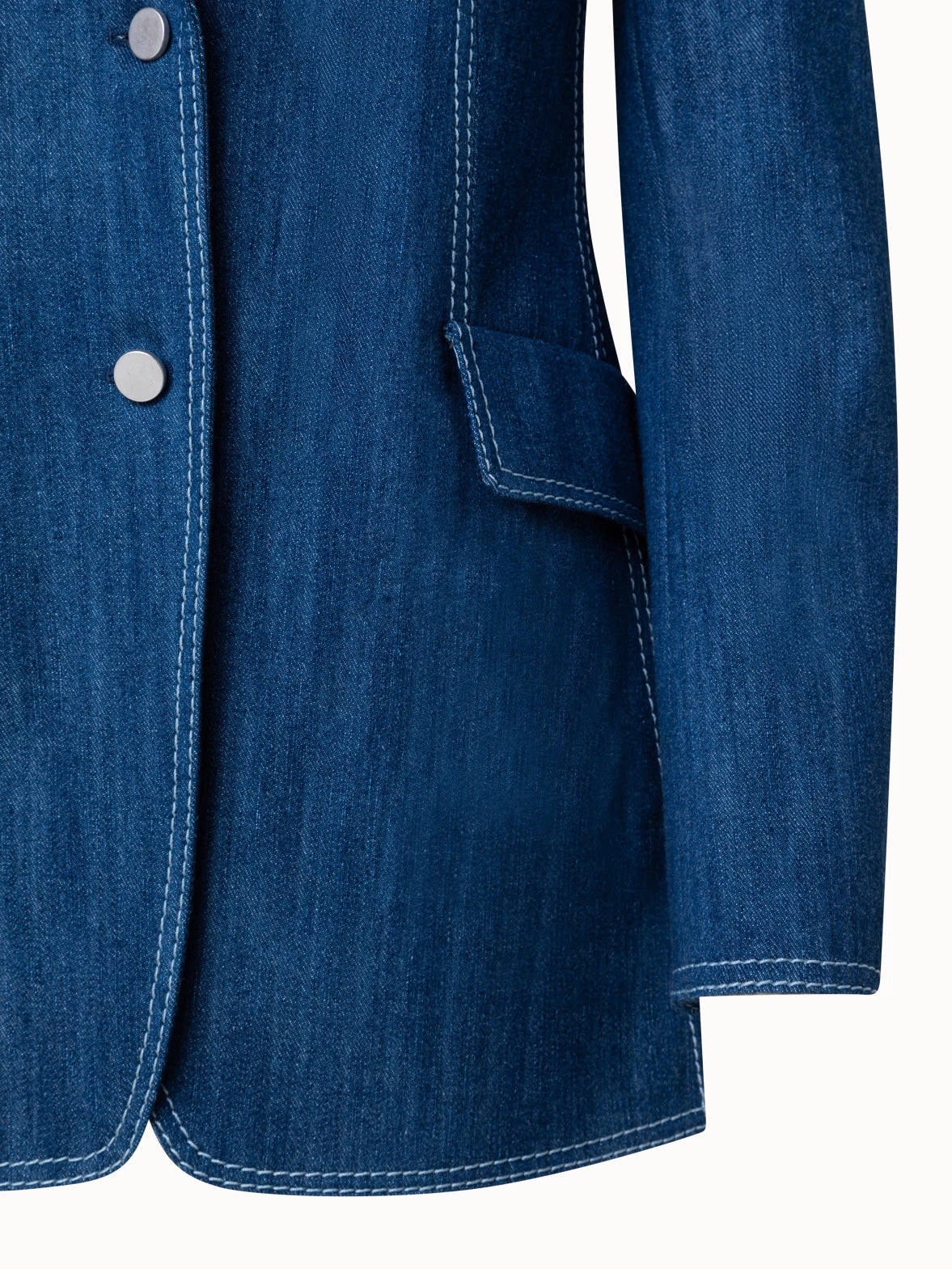This Akris punto blazer is crafted in soft, washed denim in a silhouette that combines a casual denim feel with classic tailoring. It features a lapel collar, two-button closure, and flap pockets. Seams and darts in white contrasting yarn highlight the sophisticated craftsmanship.