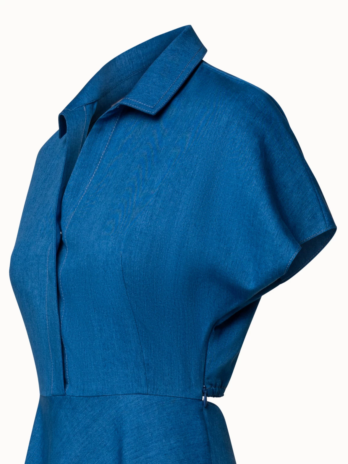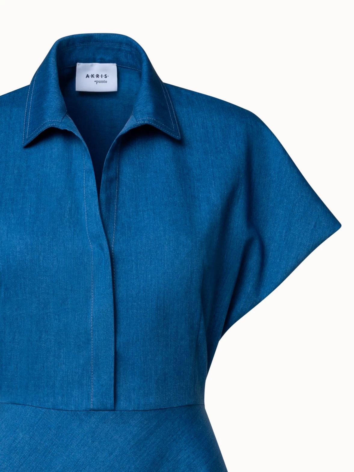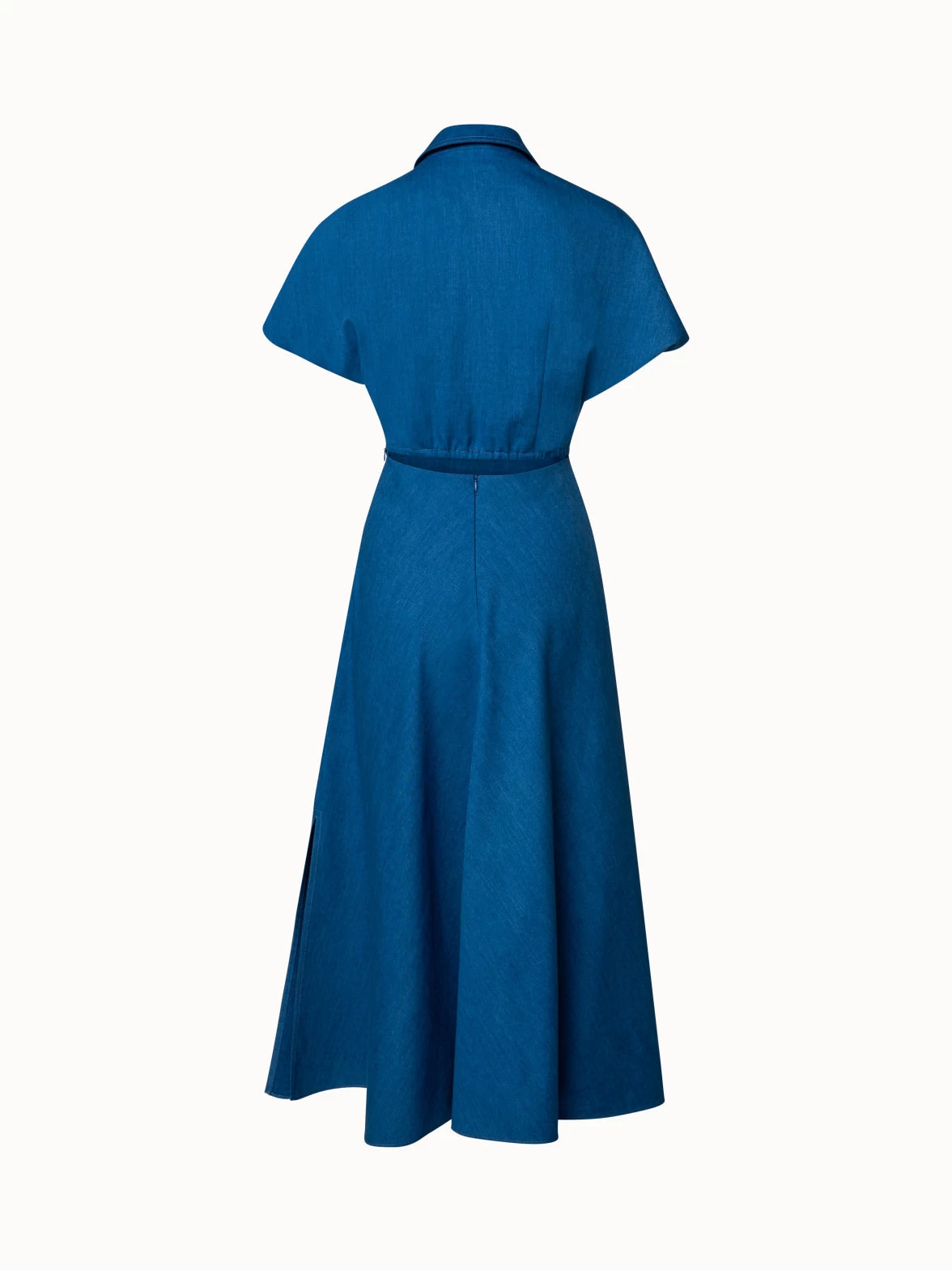 This Akris punto midi dress is crafted in soft, washed denim made from a cotton and lyocell blend. This style blends a relaxed, casual look and a sophisticated, feminine silhouette. It features a kent collar with concealed button placket, a fitted top with kimono sleeves, and flared skirt with side slits and seam pockets. The open-back detail between the top and skirt creates the illusion of an ensemble and further takes in the waist.