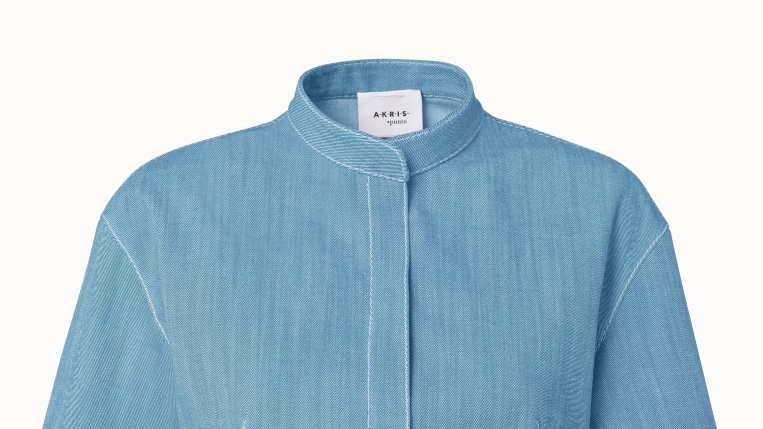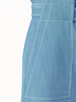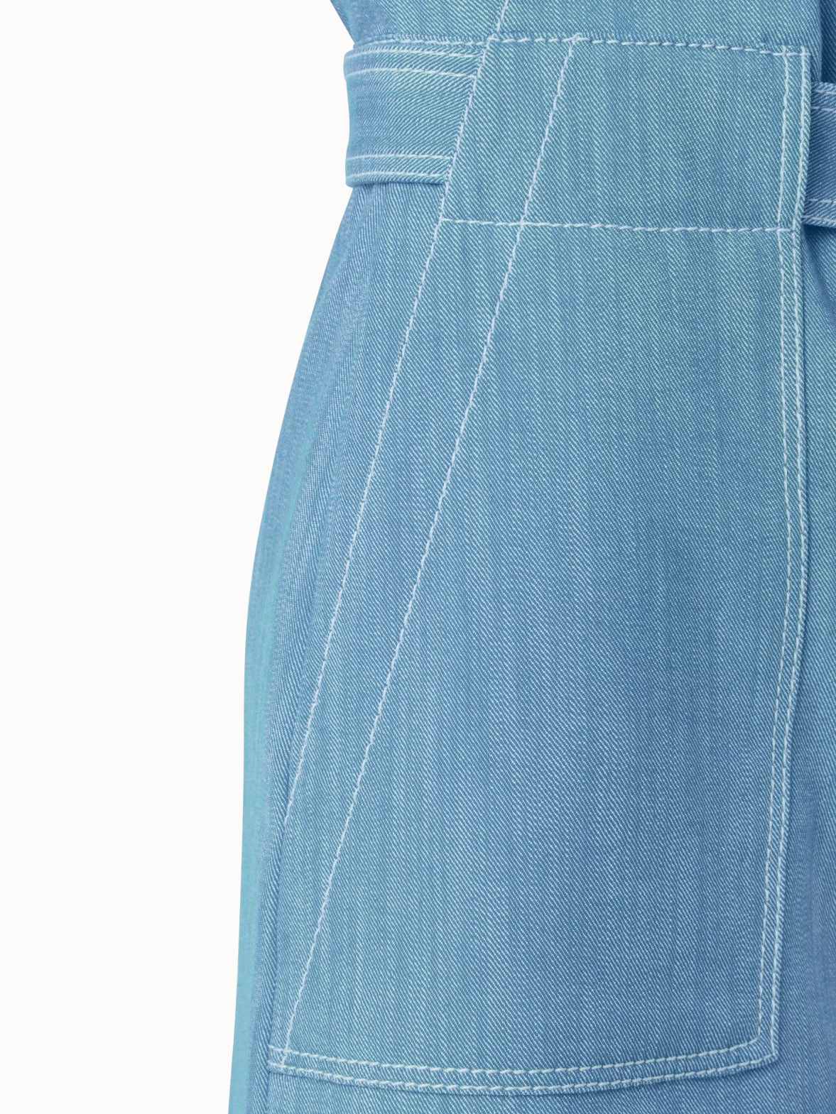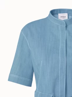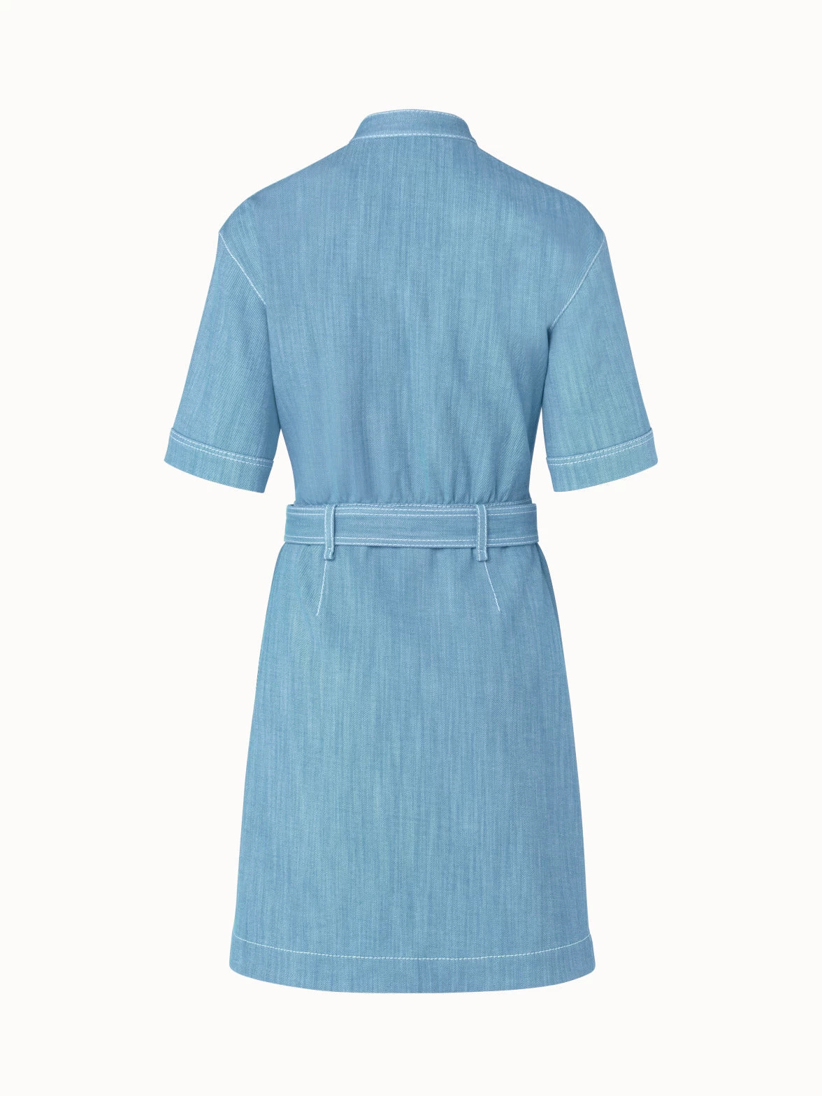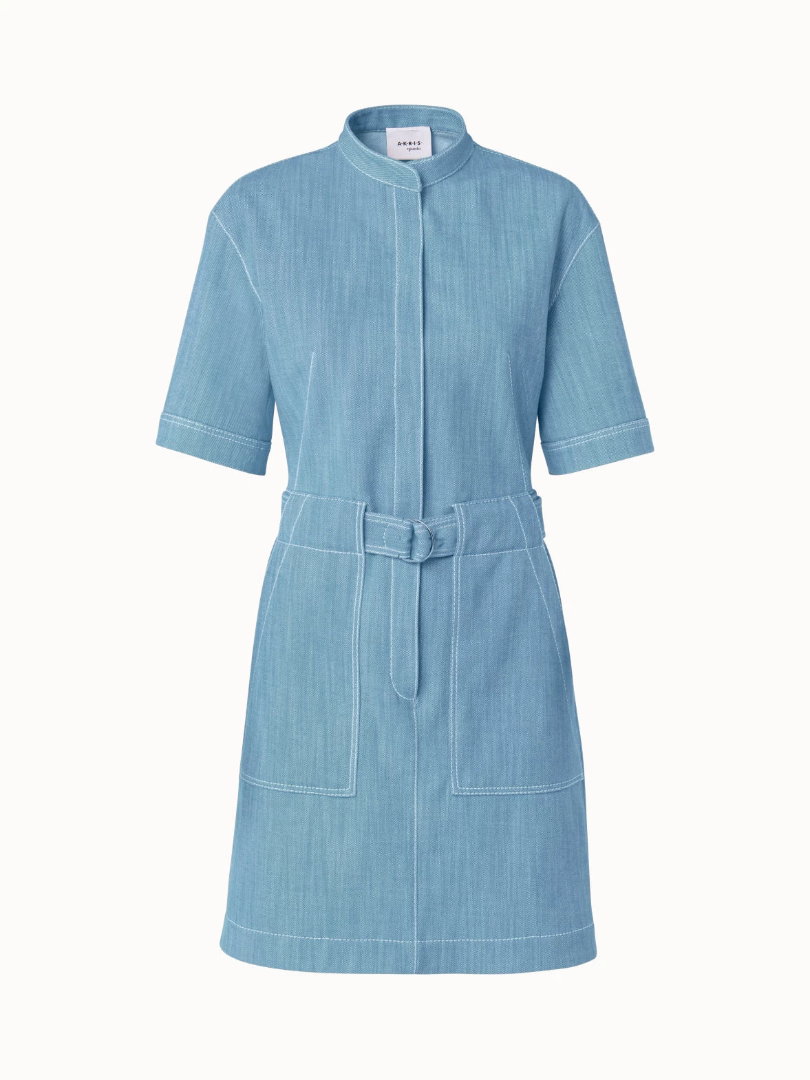 This Akris punto washed light denim dress is pure joy to wear. It is airy and breezy with short sleeves. It comes in a knee-length with patch pockets and a matching belt. The dress features a refined mandarin collar and a flat pannel conceals the front button closure.